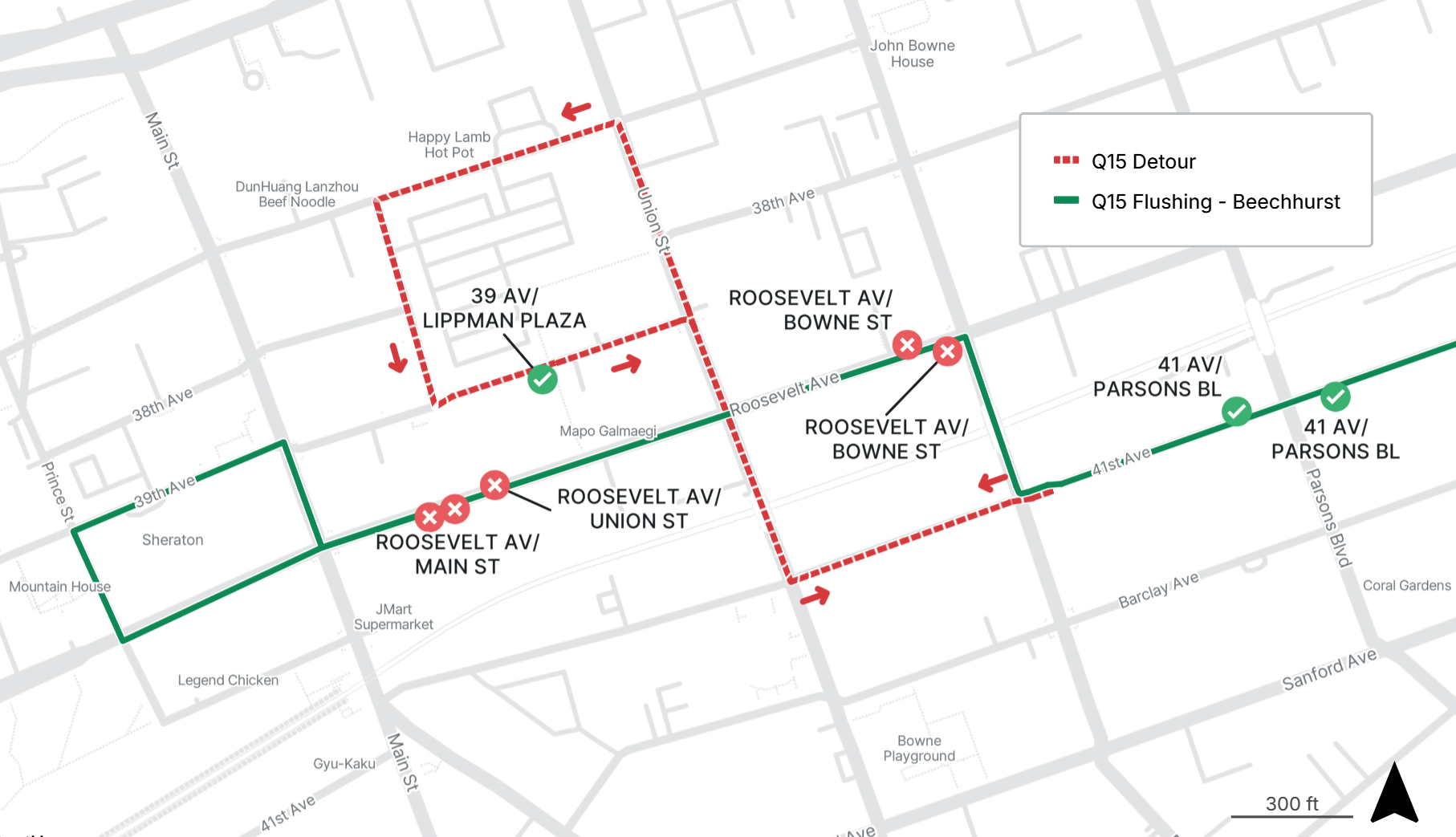 Q15 stops on Roosevelt Ave at Bowne St, Union St and Main St are closed