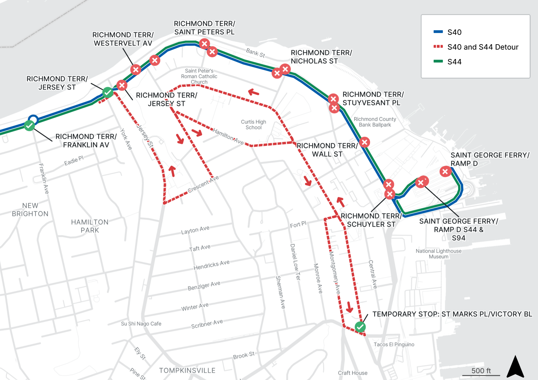 All S40 and S44 stops along Richmond Terrance between Jersey St and St George Ferry Terminal are closed