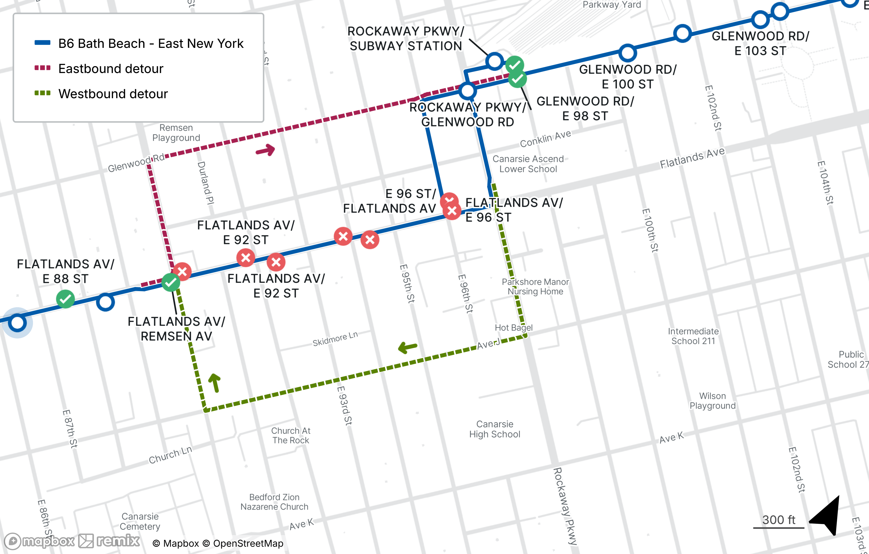 B6 local and limited buses will be detoured between Flatlands Ave at Remsen Ave and Rockaway Pkwy at Avenue J