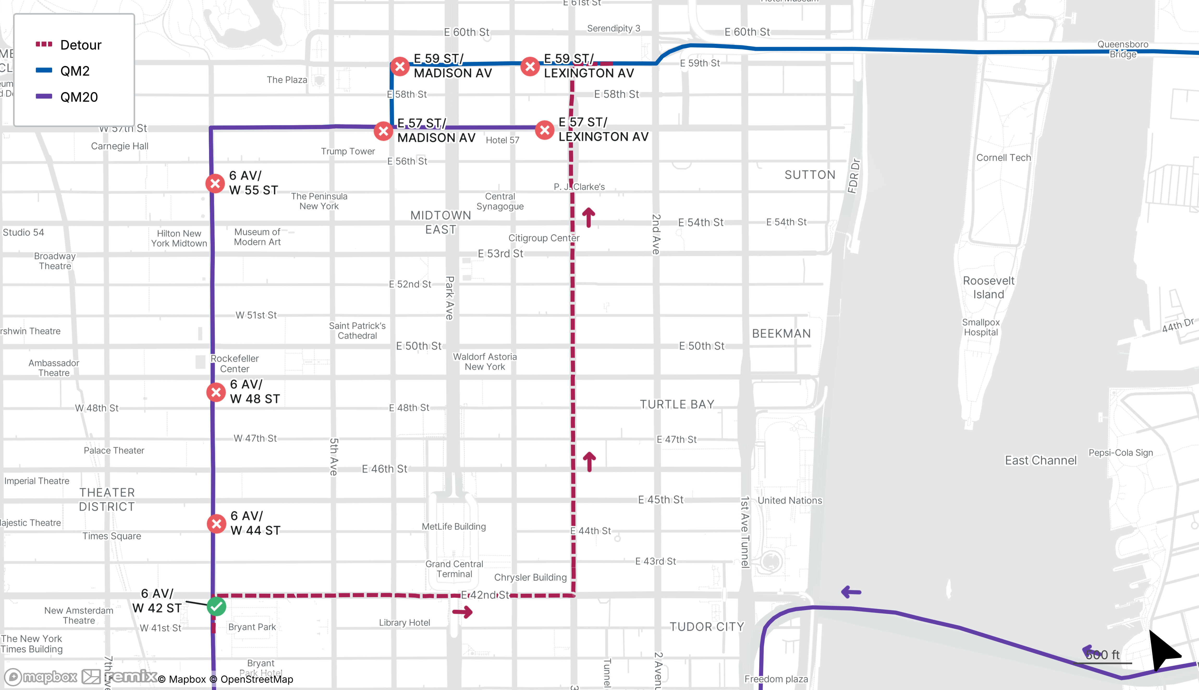 Eastbound QM2 and QM20 buses will be detoured from 6th Ave at W 42nd St to 3rd Ave at E 59th St