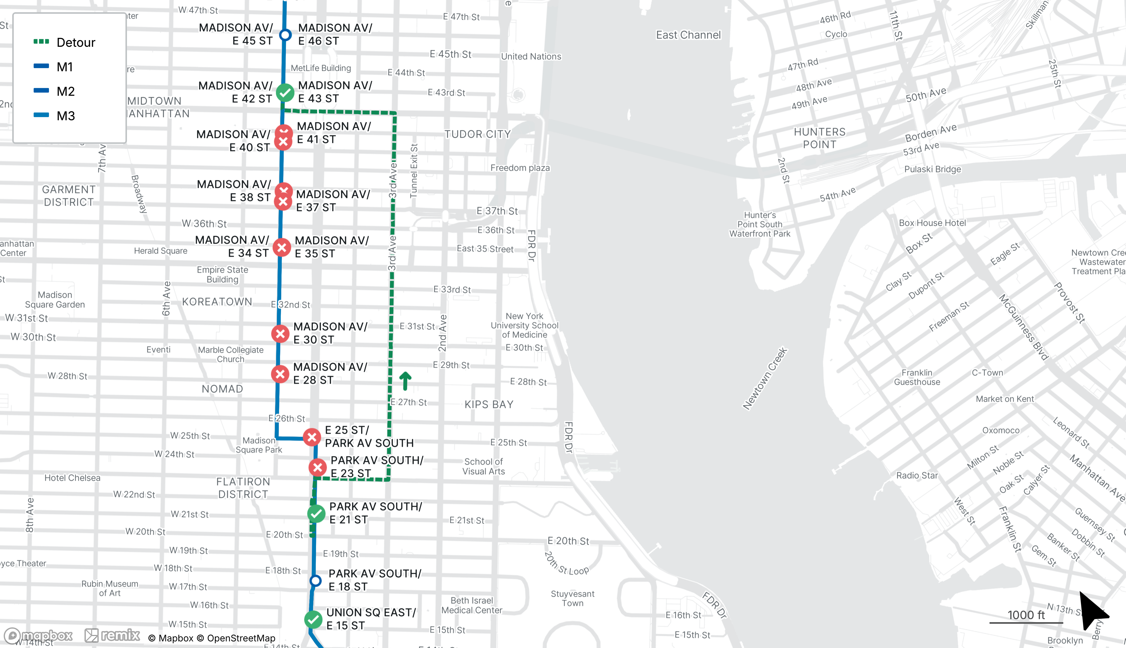 Northbound M1, M2, and M3 stops on Park Ave South at E 23rd St and E 25th St, and on Madison Ave from E 28th St to E 41st St will be closed