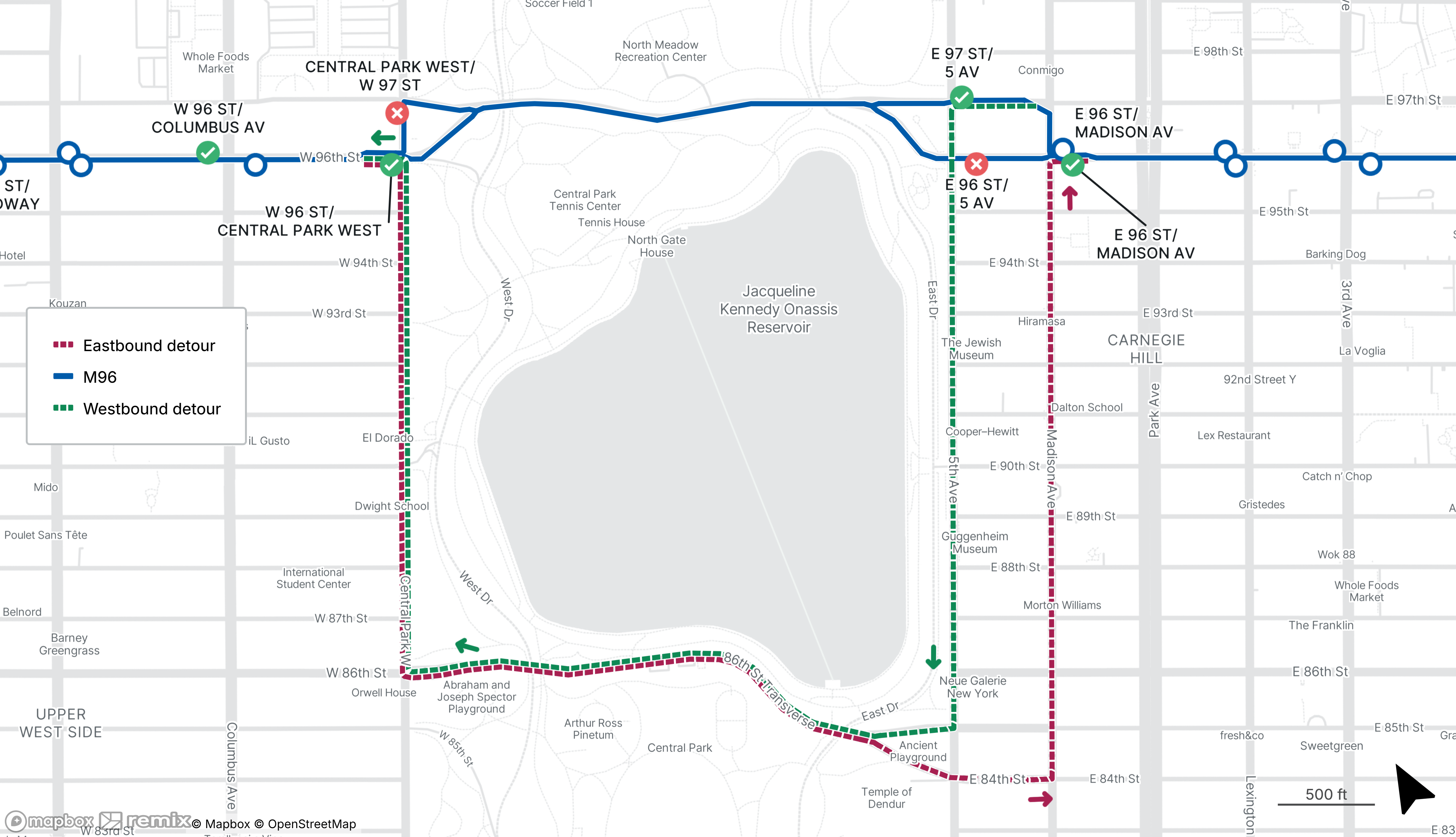 Buses use the 96th Street Transverse. See map
