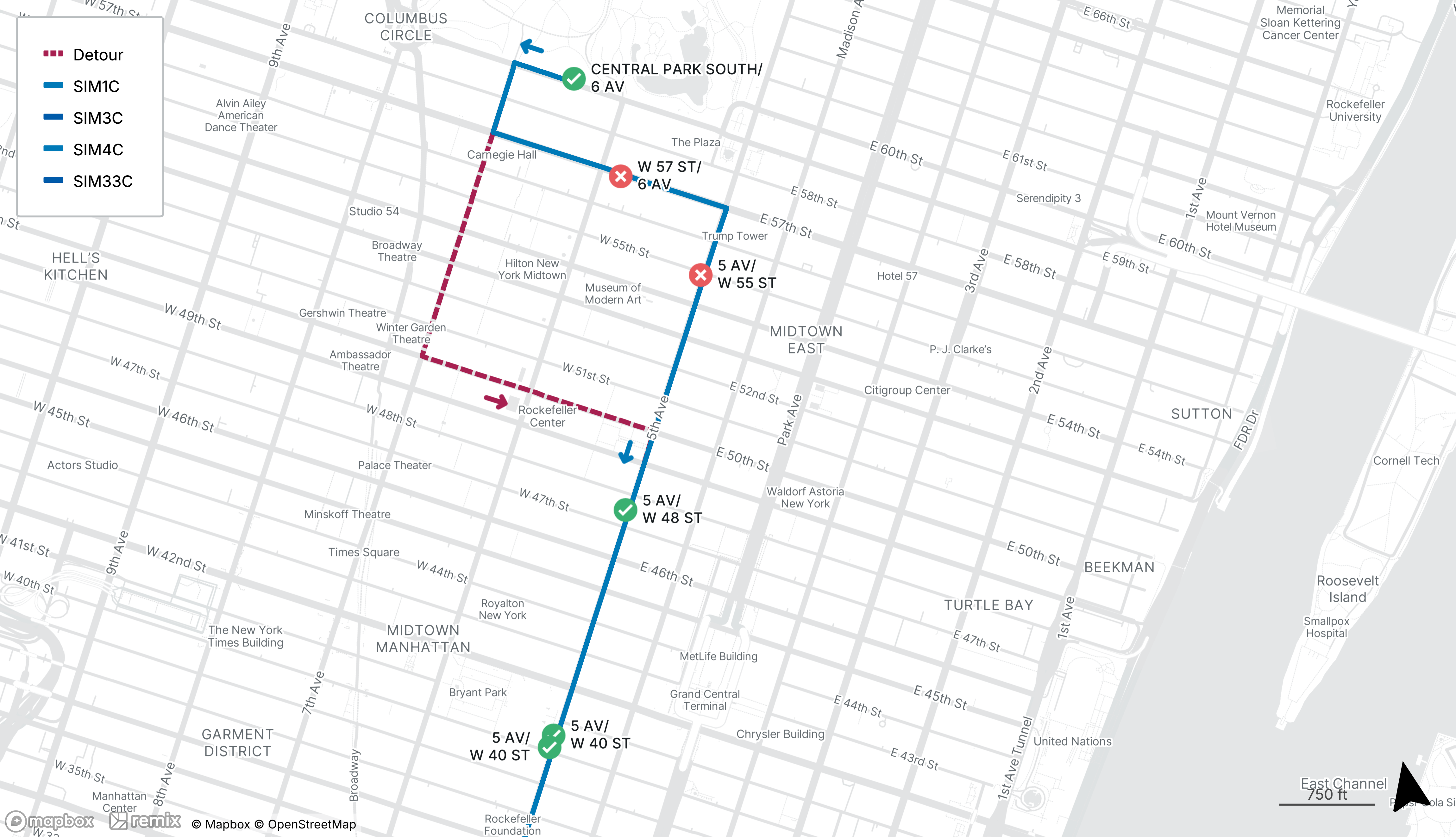 Southbound SIM1C, SIM3C, SIM4C, and SIM33C stops on W 57th St at 6th Ave and 5th Ave at 55th St will be closed