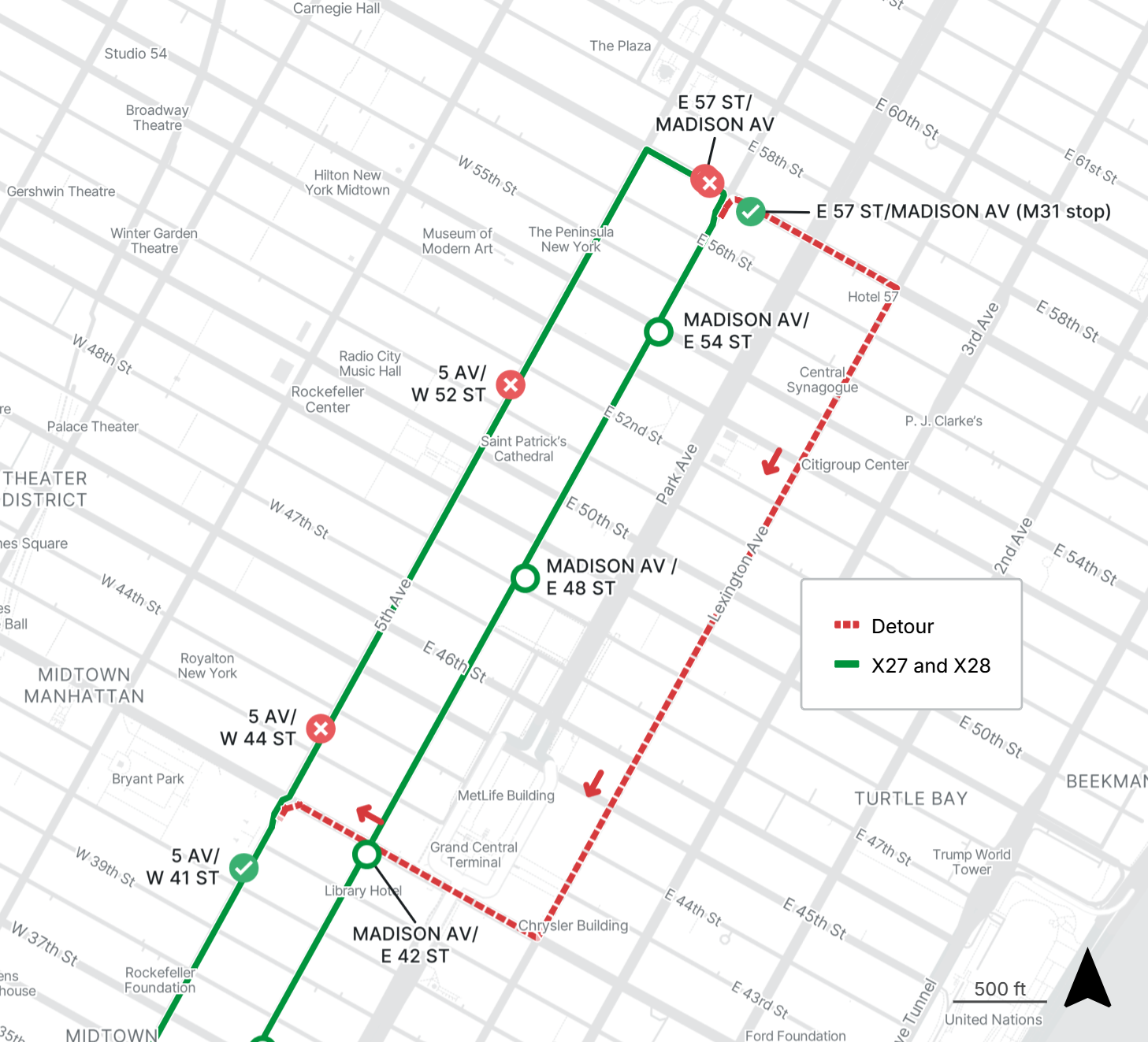 X27 and X28 stops on E 57th St at Madison Ave, 5th Ave at W 52nd St and 5th Ave at W 44th St are closed