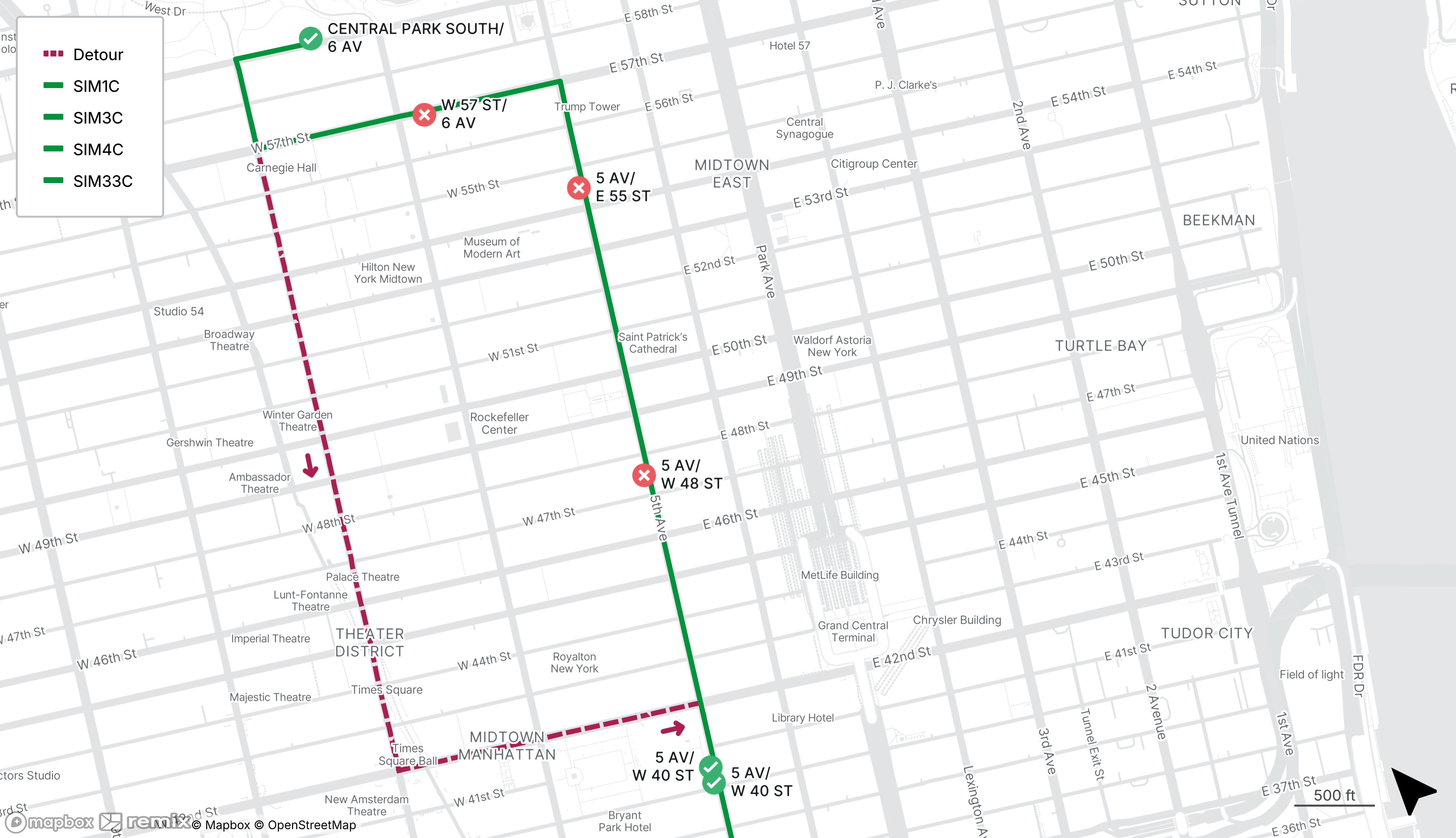Southbound SIM1C, SIM3C, SIM4C and SIM33C stops on W 57th St at 6th Ave and on 5th Ave at E 55th St and W 48th St will be closed
