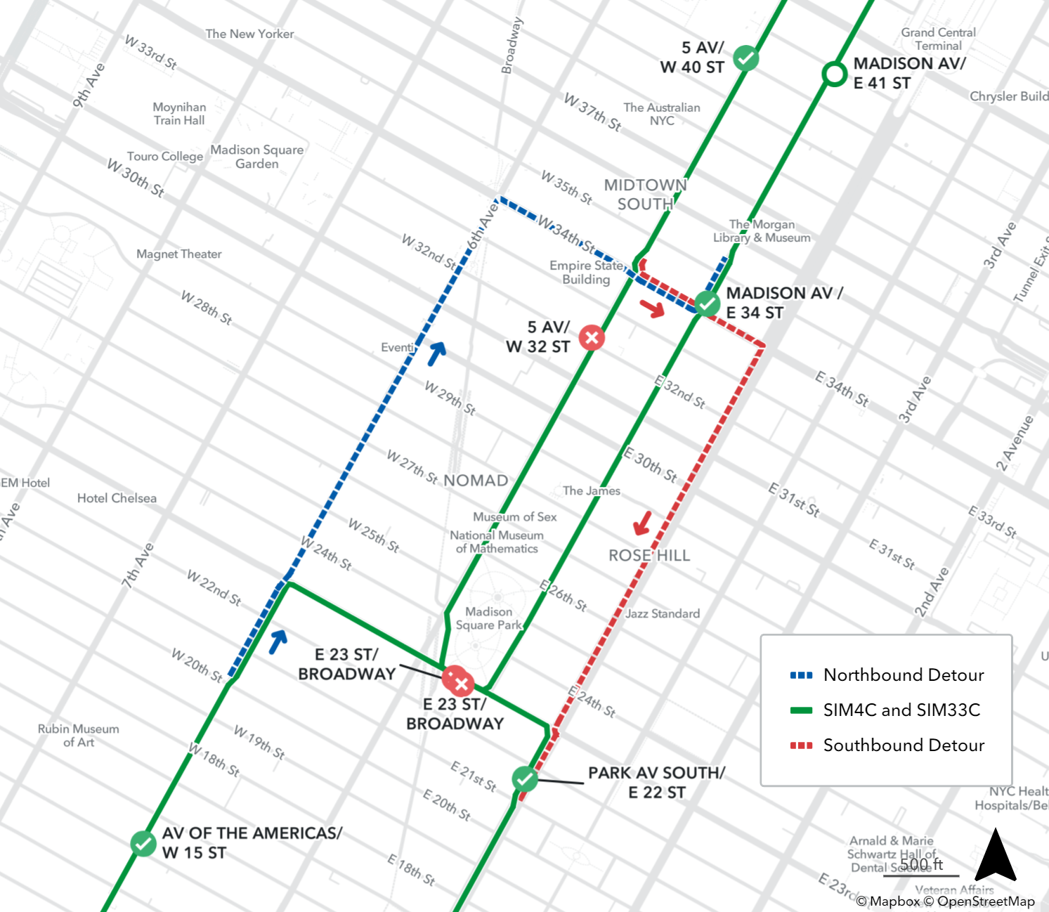 SIM4C and SIM33C stops on E 23rd St at Broadway and the southbound stop on 5th Ave at W 32nd St are closed