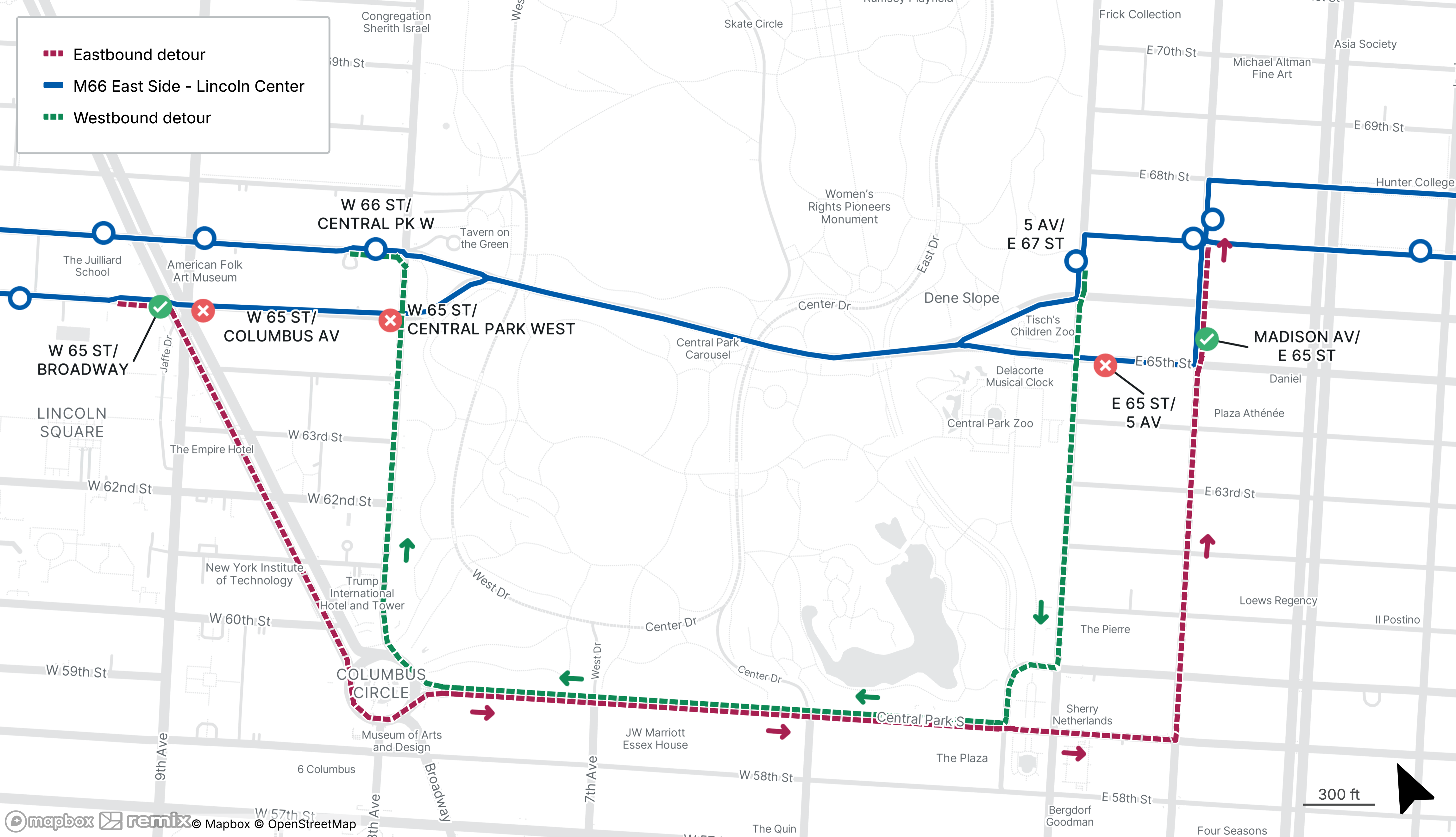 M66 buses will be detoured from the 65th St Transverse in both directions and the eastbound stops along 65th St from Columbus Ave to 5th Ave will be closed