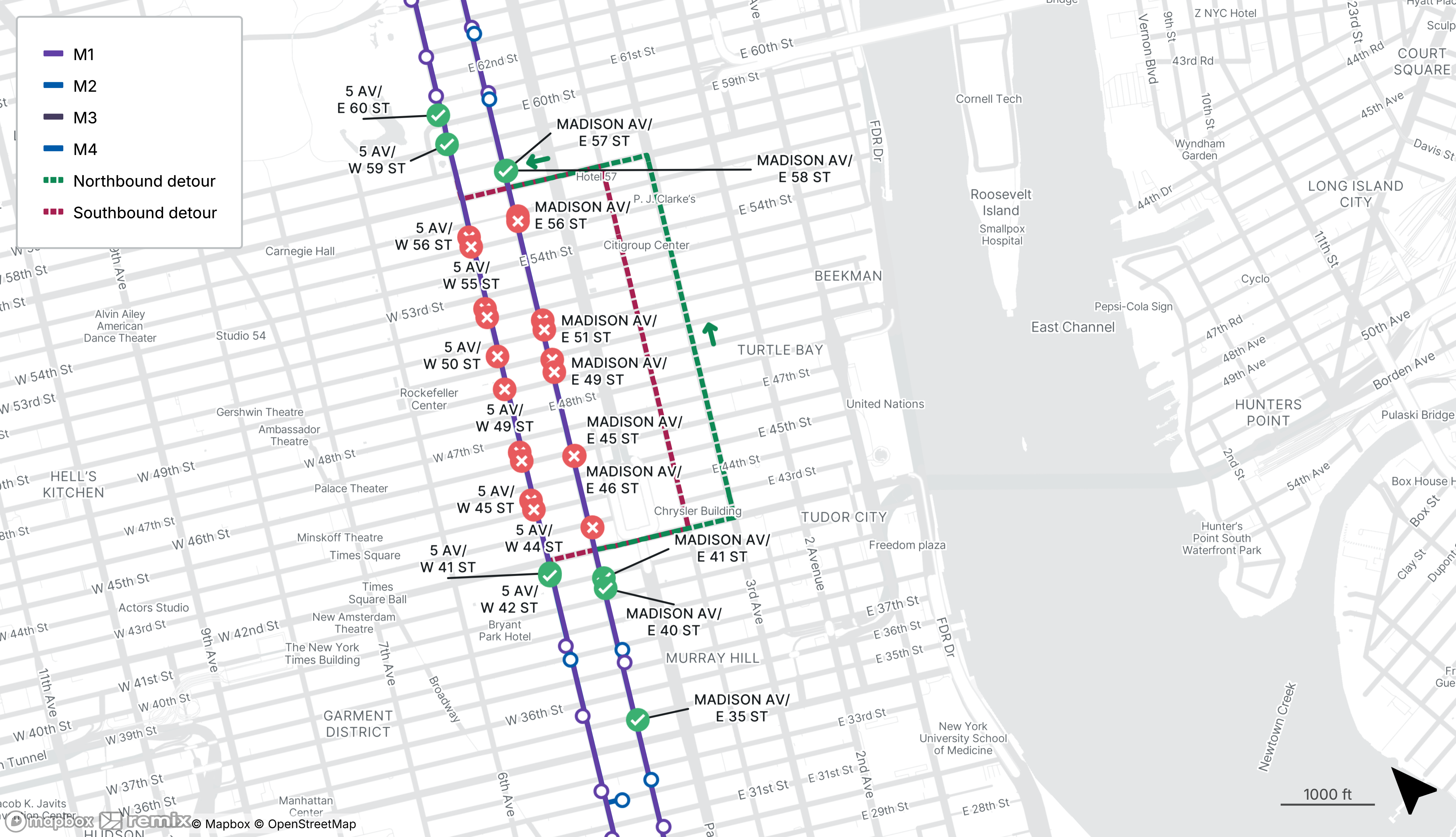 M1, M2, M3 and M4 buses will be detoured between 5th Ave at E 57th St and Madison Ave at E 42nd St