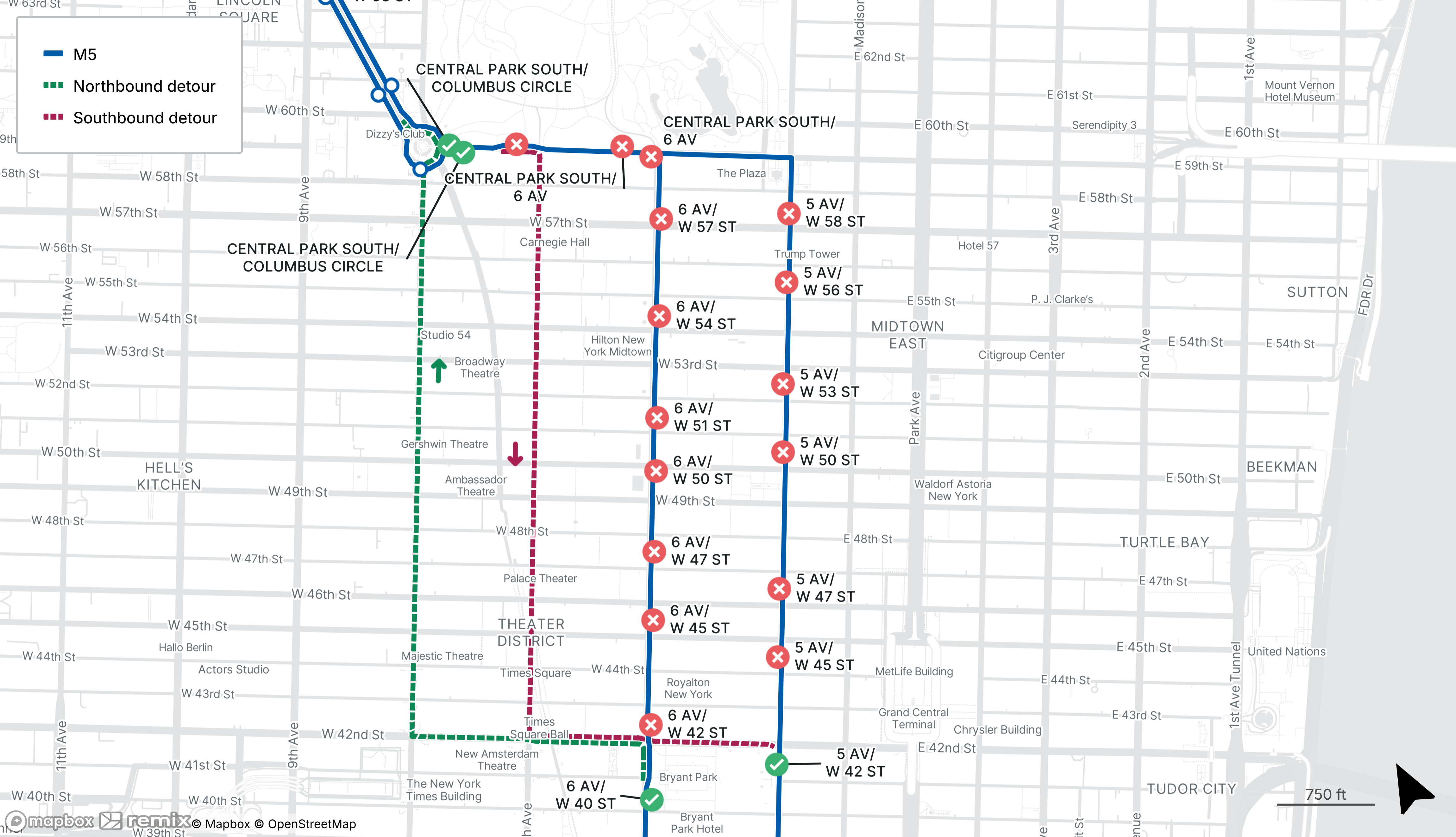 M5 buses will be detoured between Central Park South at 7th Ave and 6th Ave and W 42nd St