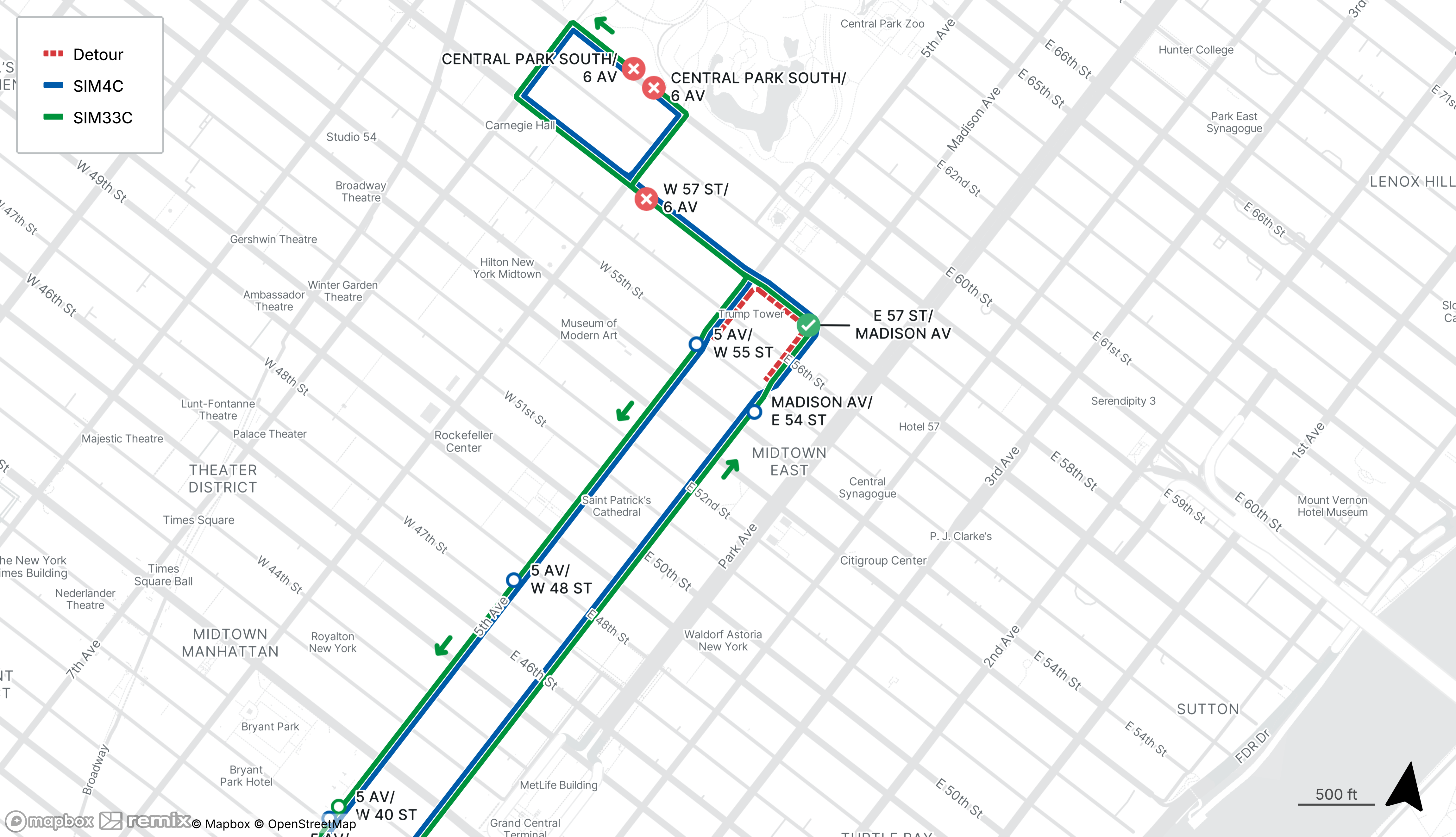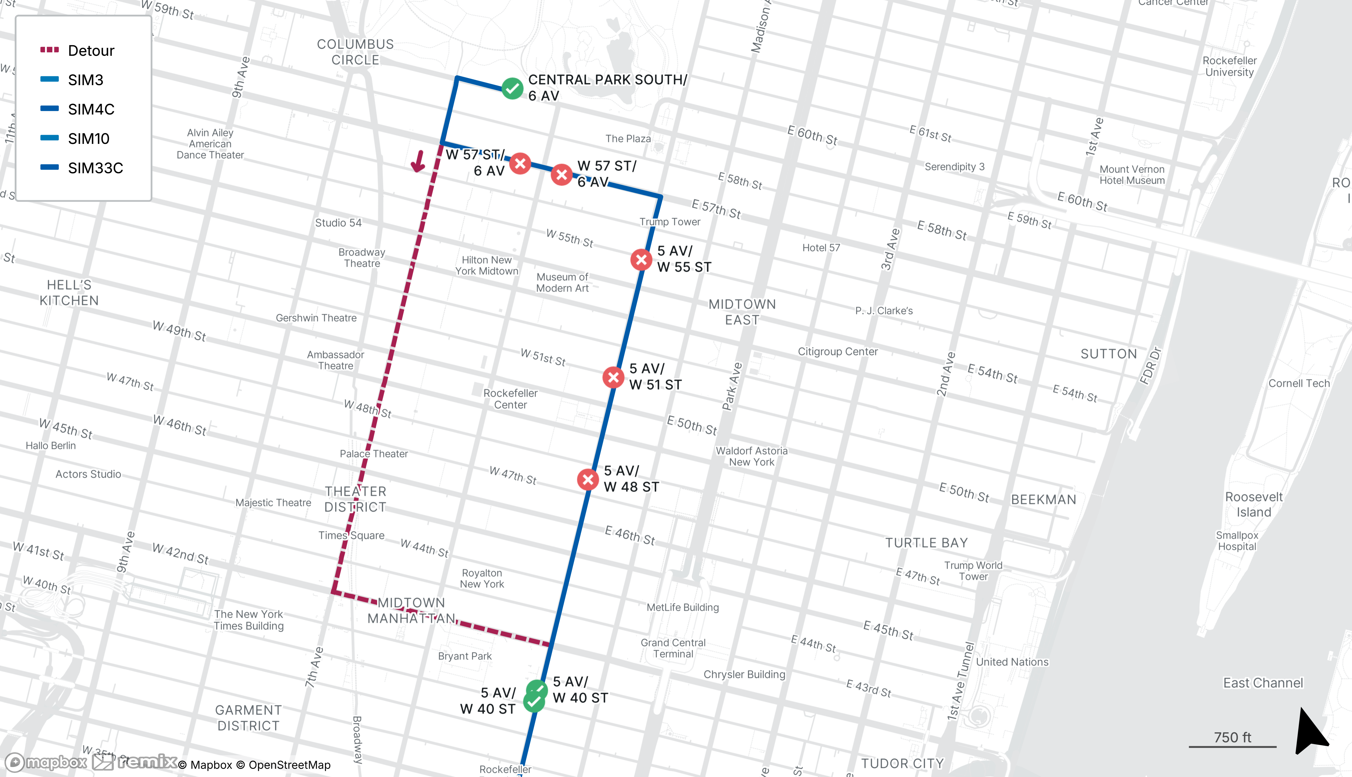 Southbound SIM3, SIM4C, SIM10 and SIM33C stops on W 57th St at 6th Ave and 5th Ave at E 55th St/W 51st St and W 48th St will be closed