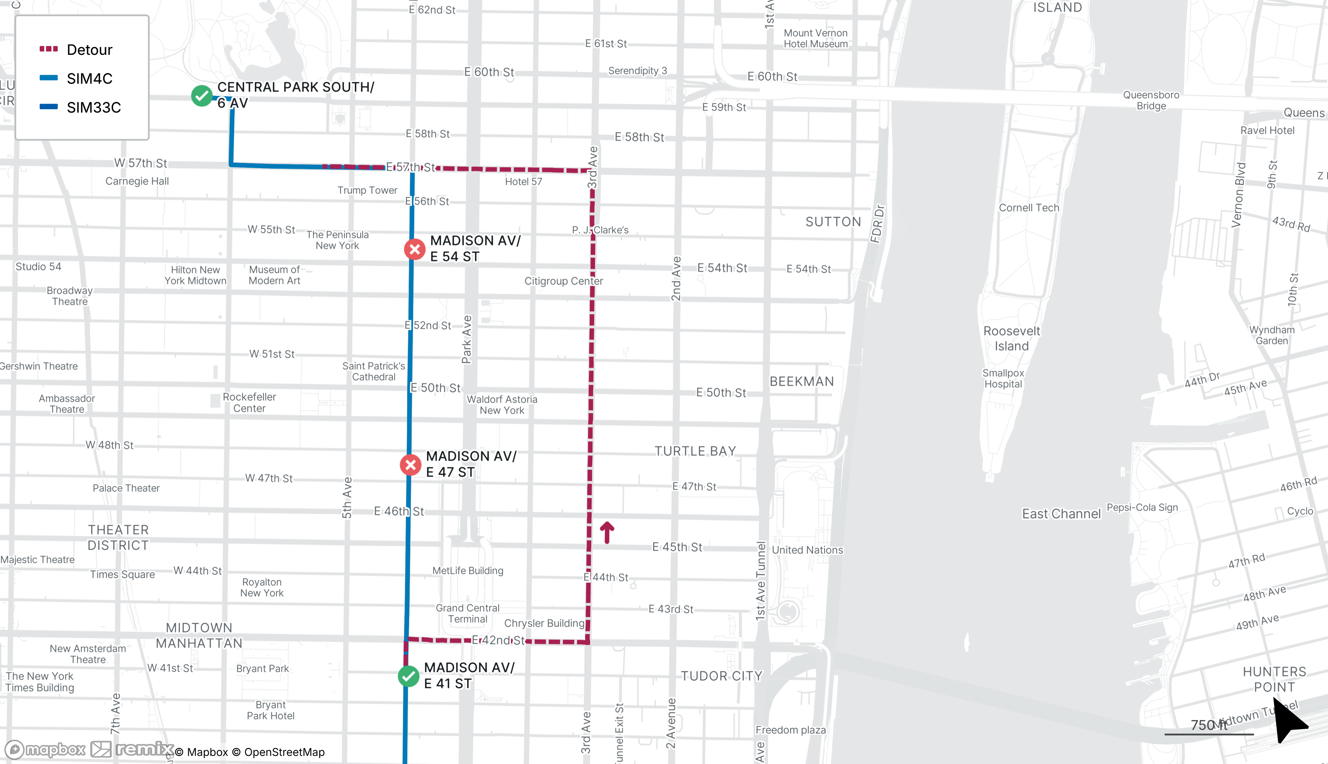 Northbound SIM4C and SIM33C stops on Madison Ave at E 47th St and E 54th St will be closed