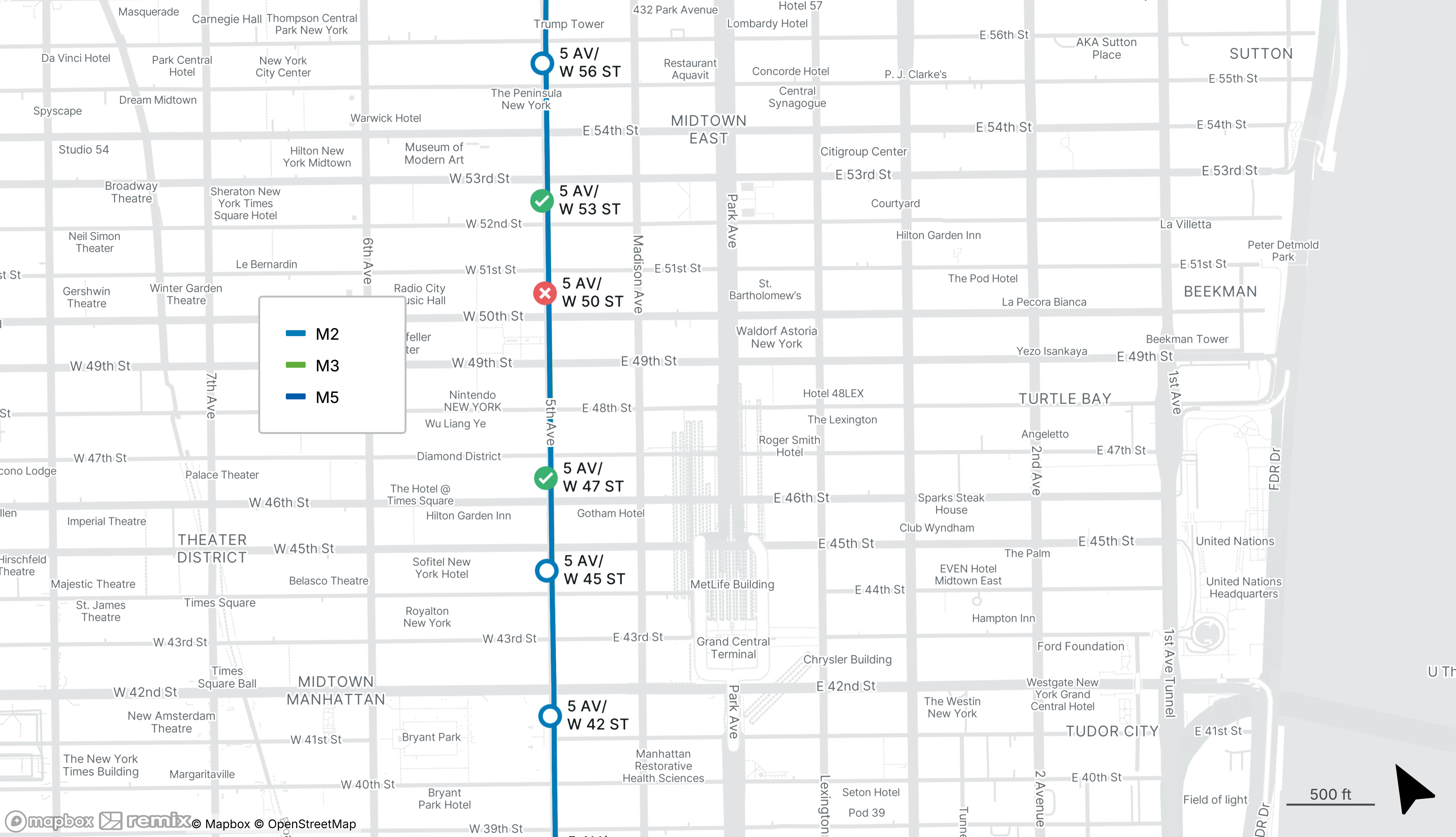 Southbound M2. M3. and M5 bypass the stop on 5th Ave at W 50th St - use the stops on W 53rd S or W 47th St