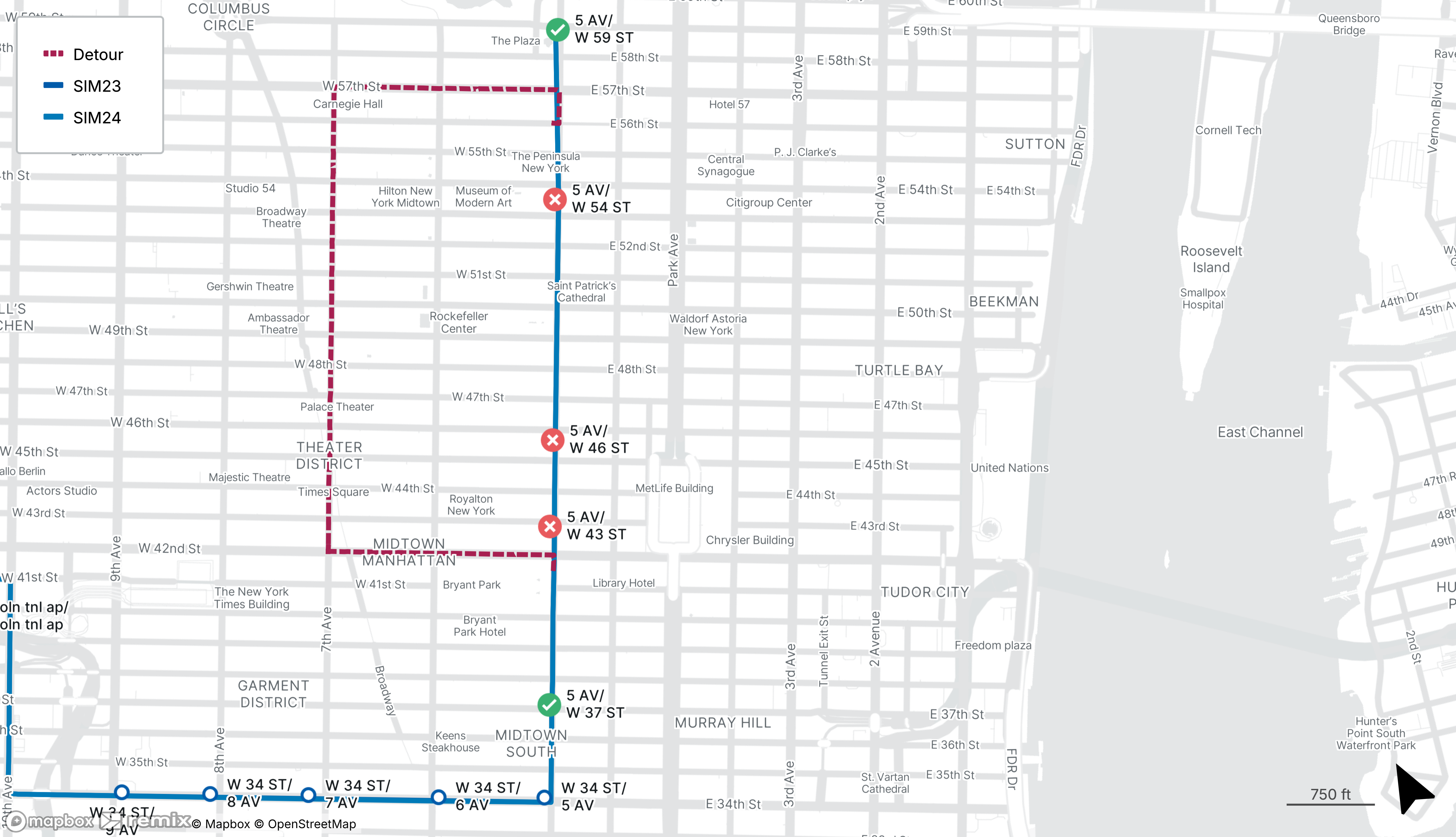 Southbound SIM23 and SIM24 stops on 5th Ave from W 54th St to W 43rd St will be closed