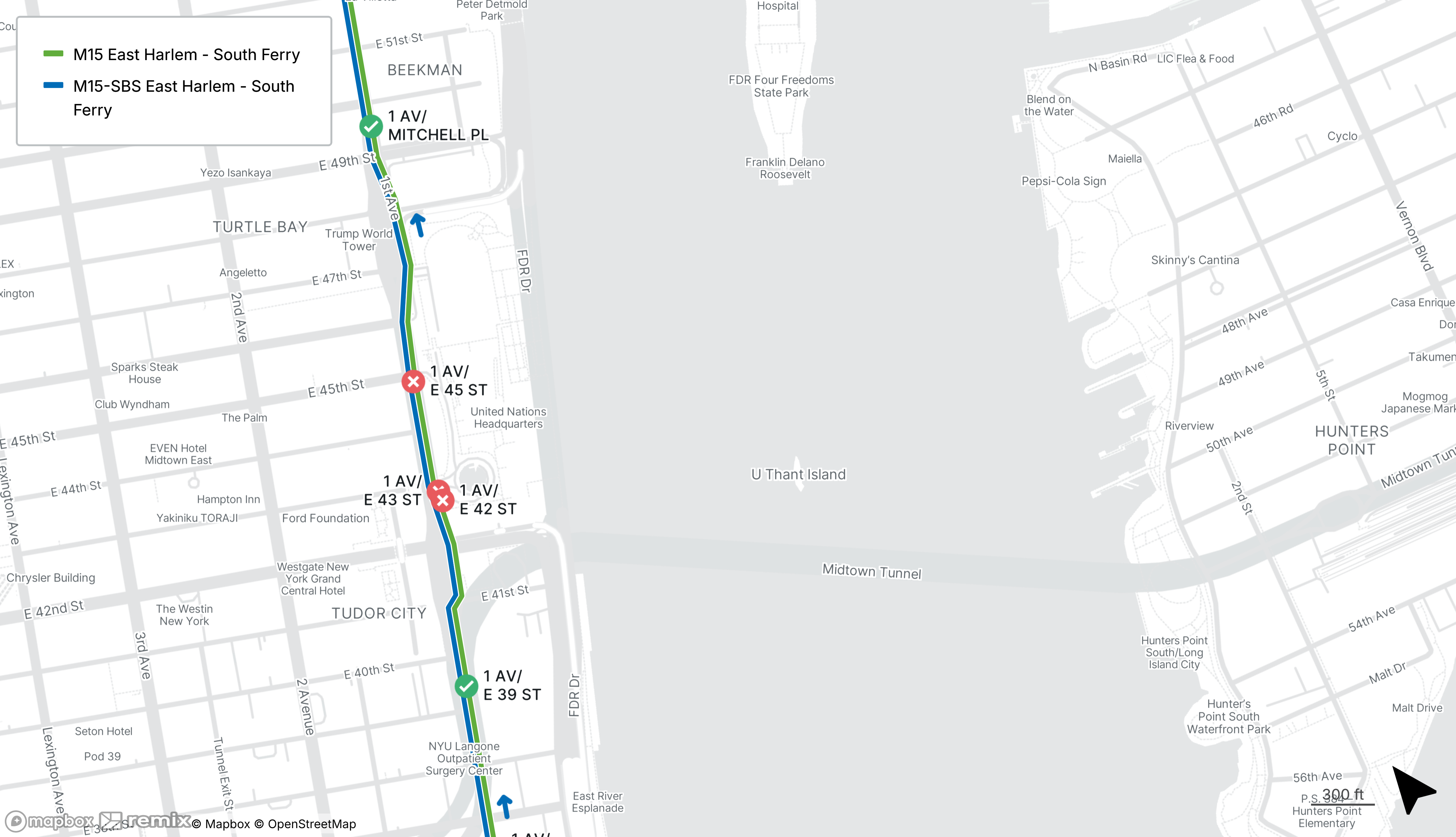Northbound M15 and M15-SBS stops on 1st Ave at E 42nd St/E 43rd St and E 45th St/Mitchell Pl will be closed