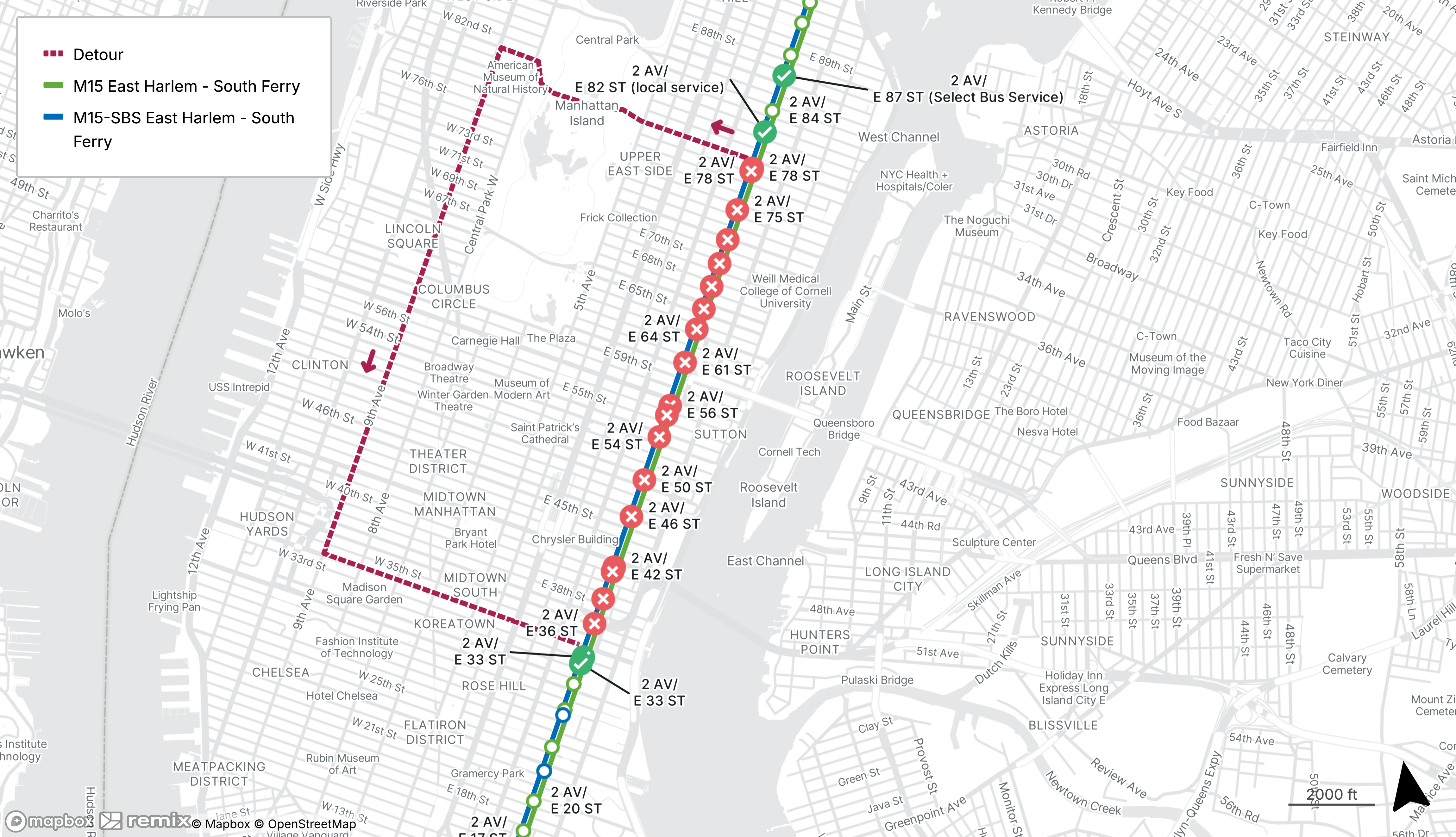 Southbound M15 and M15-SBS stops on 2nd Ave from E 78th St to E 36th St will be closed