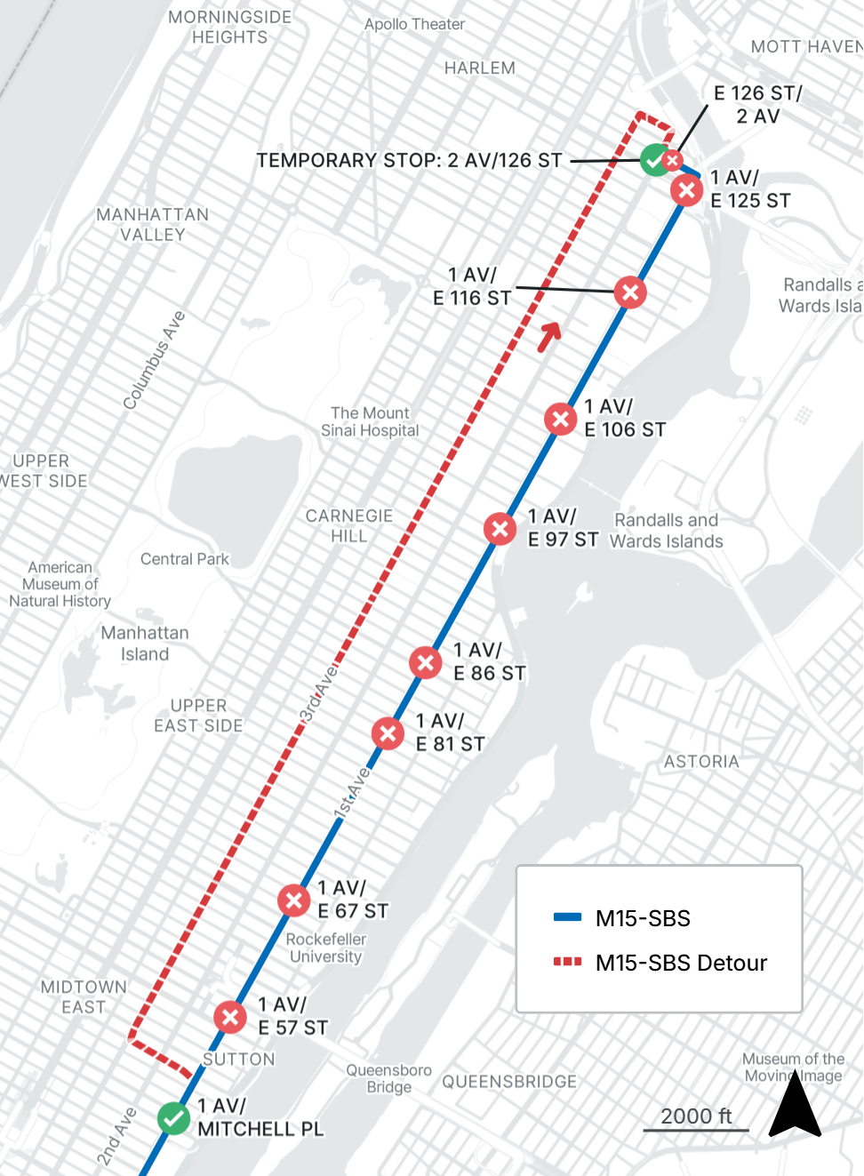 Northbound M15-SBS stops along 1st Ave from E 57th St to E 125th St and on E 126th St at 2nd Ave are closed