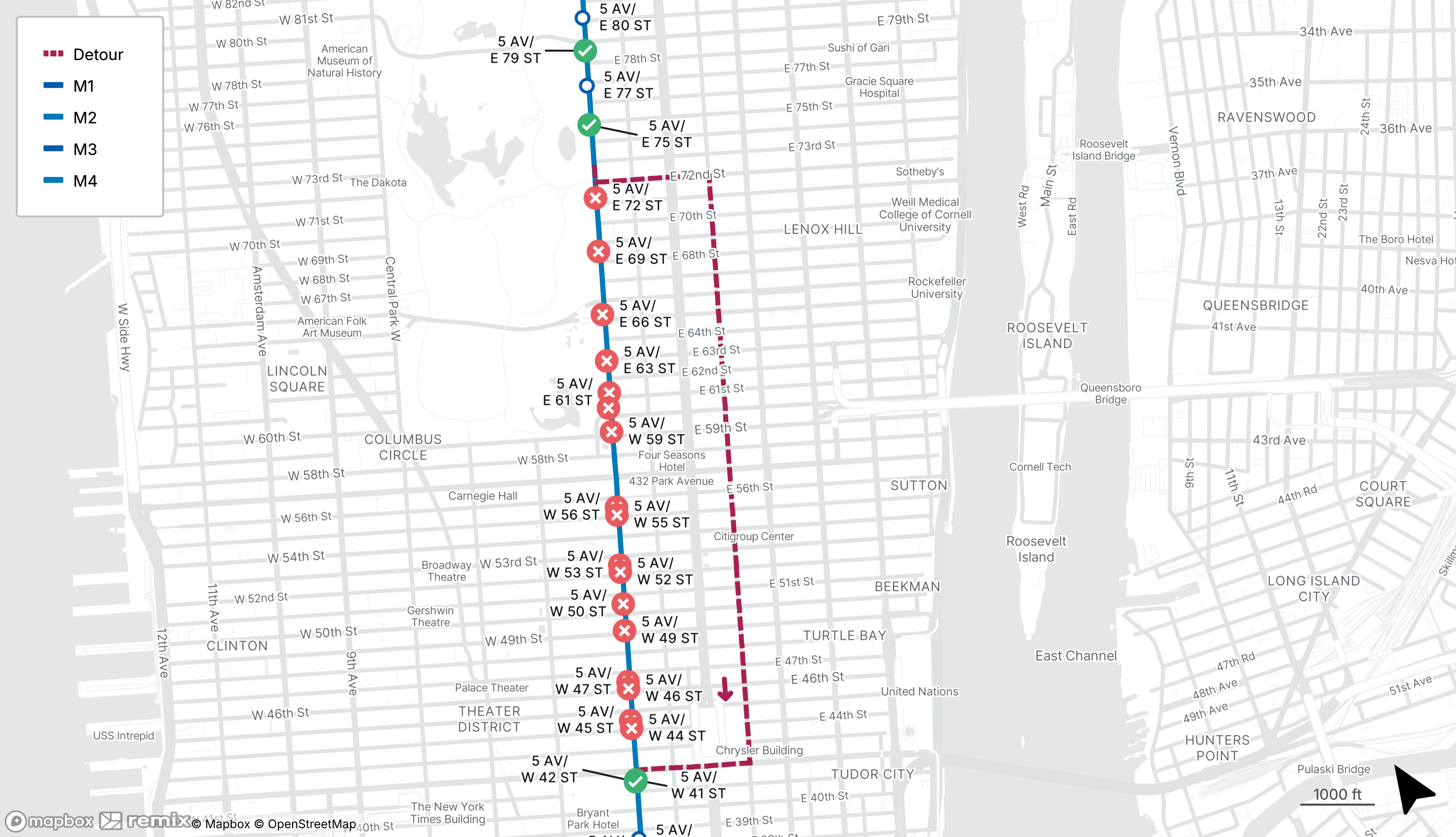 Southbound M1, M2, M3 and M4 stops on 5th Ave from E 72nd St to W 44th St will be closed