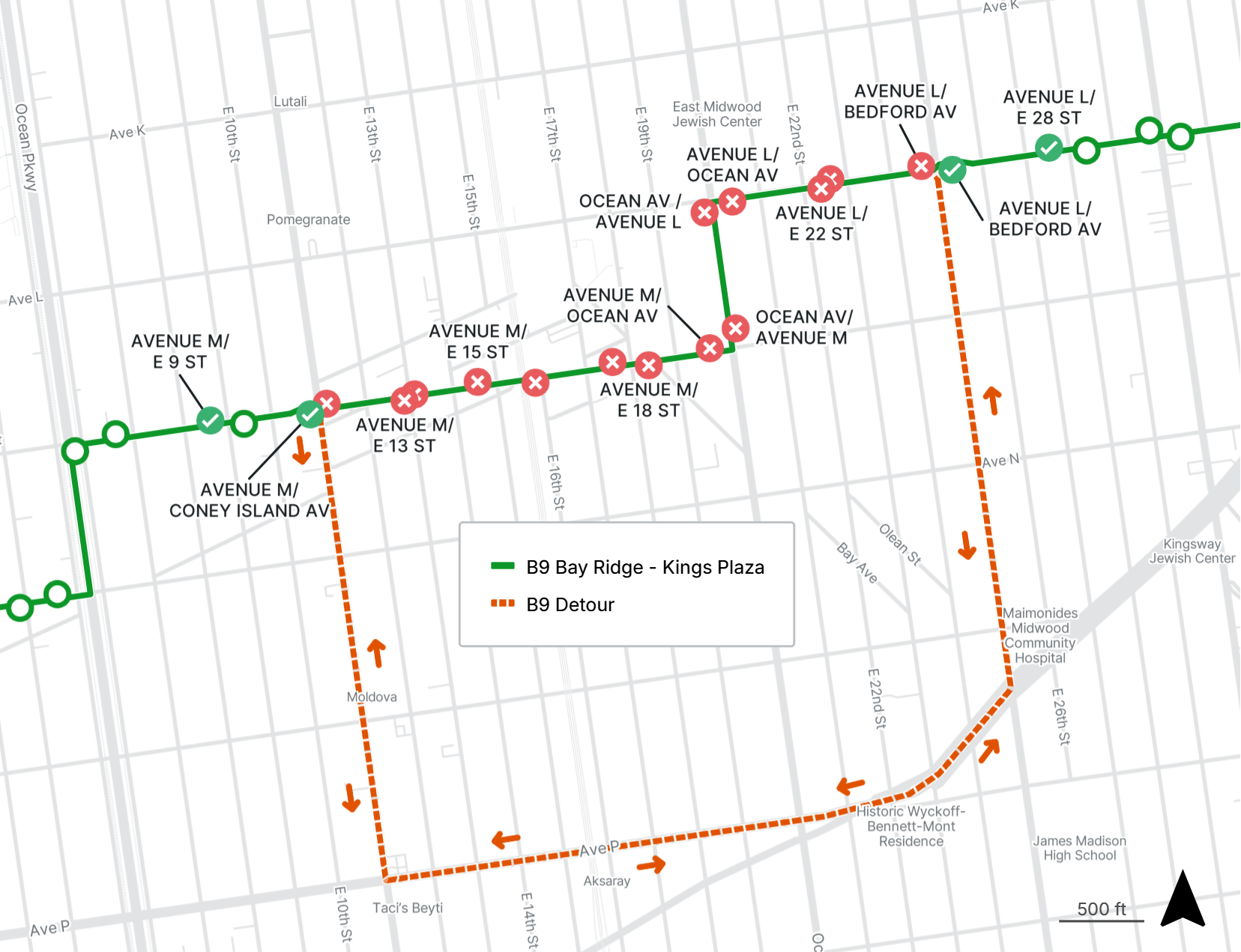 StartedB9 buses are detoured in both directions between Avenue M at Coney Island Ave and Avenue L at Bedford Ave