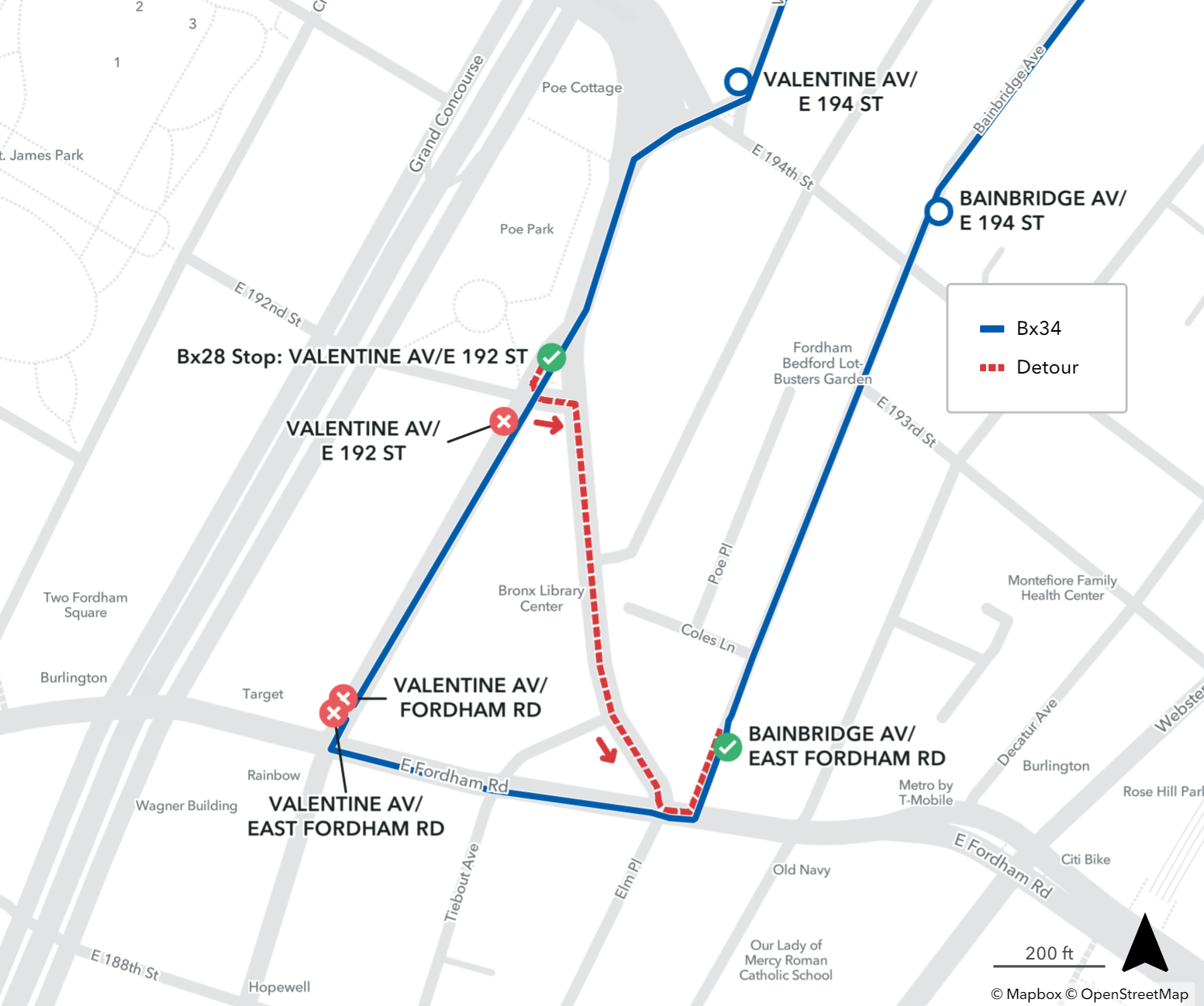 Southbound Bx34 stops on Valentine Ave at E 192nd St and Fordham Rd will be closed