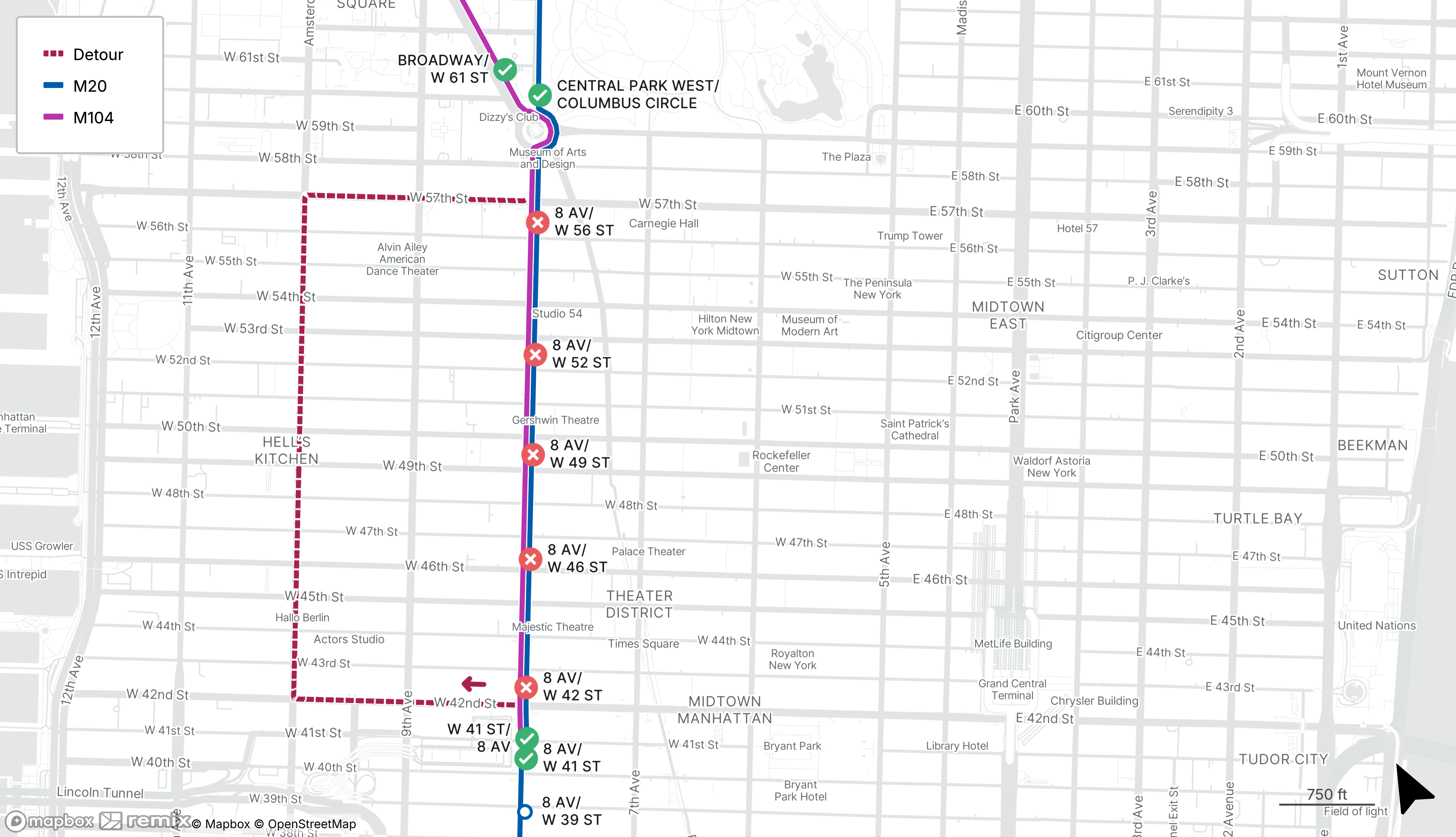 Northbound M20 and M104 stops on 8th Ave from W 42nd St to W 56th St will be closed