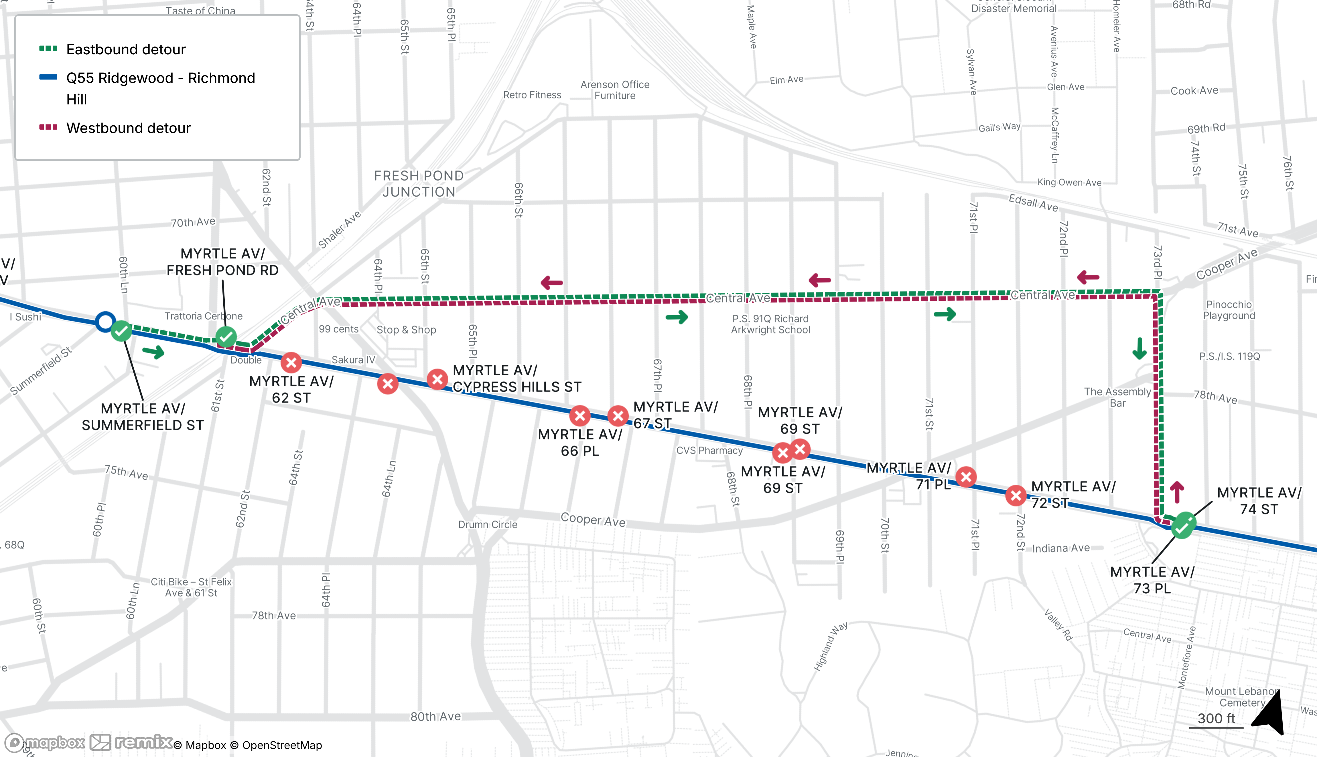 Q55 buses will be detoured from Myrtle Ave between Central Ave and 73rd Pl
