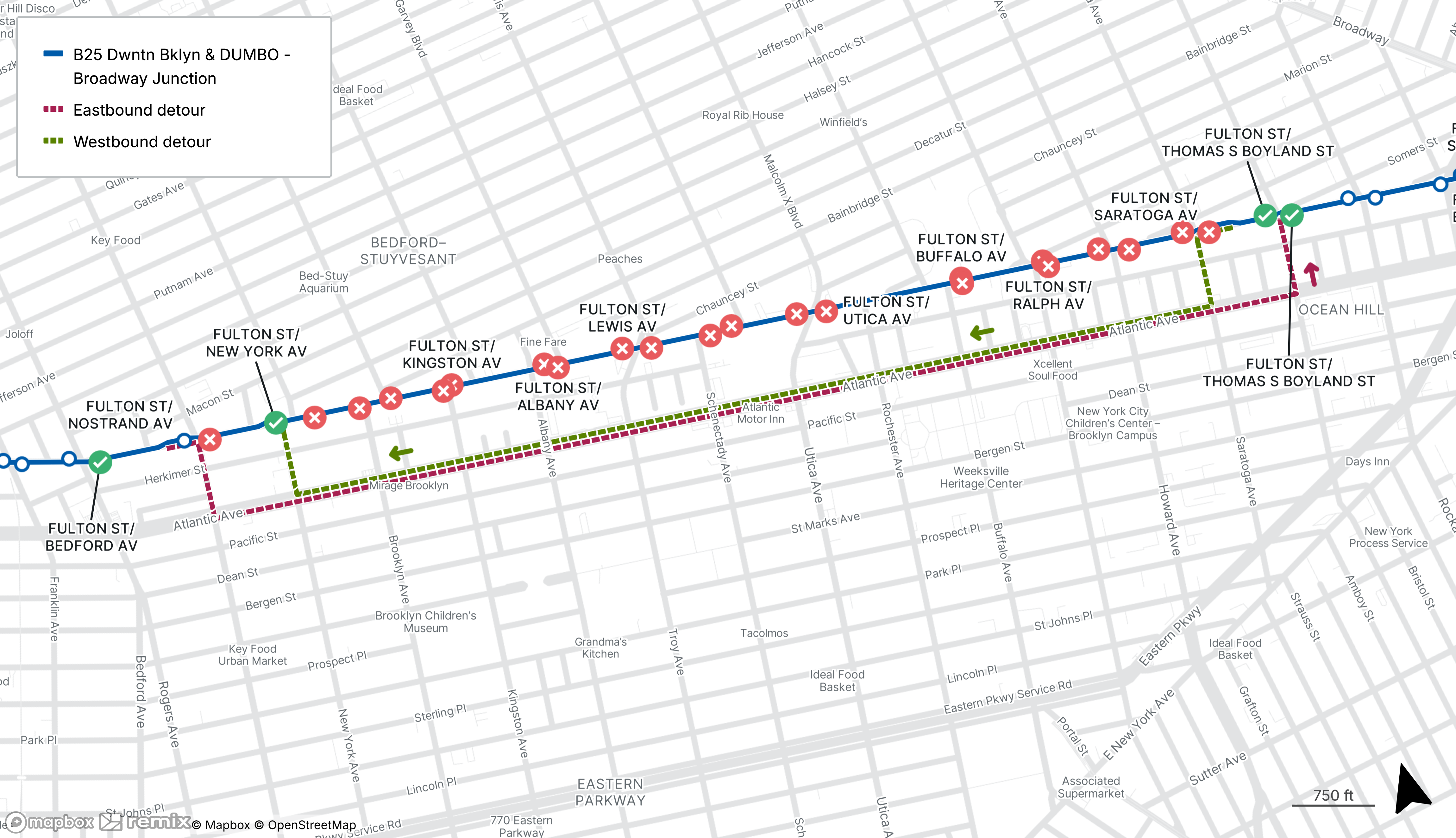 B25 buses will be detoured from Fulton St between Saratoga Ave and Nostrand Ave
