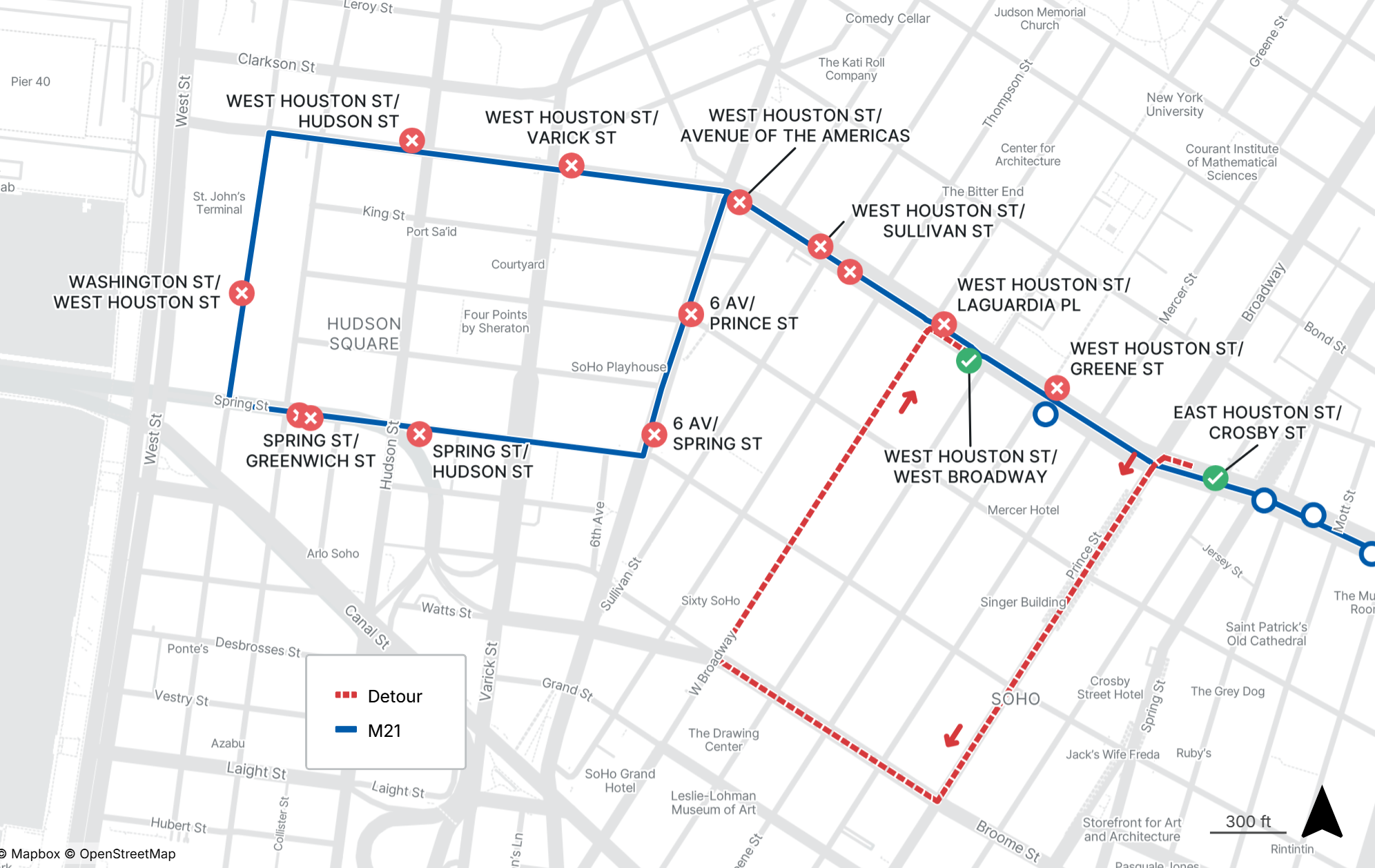 No M21 service between W Houston St at W Broadway and Hudson Square and westbound buses are detoured
