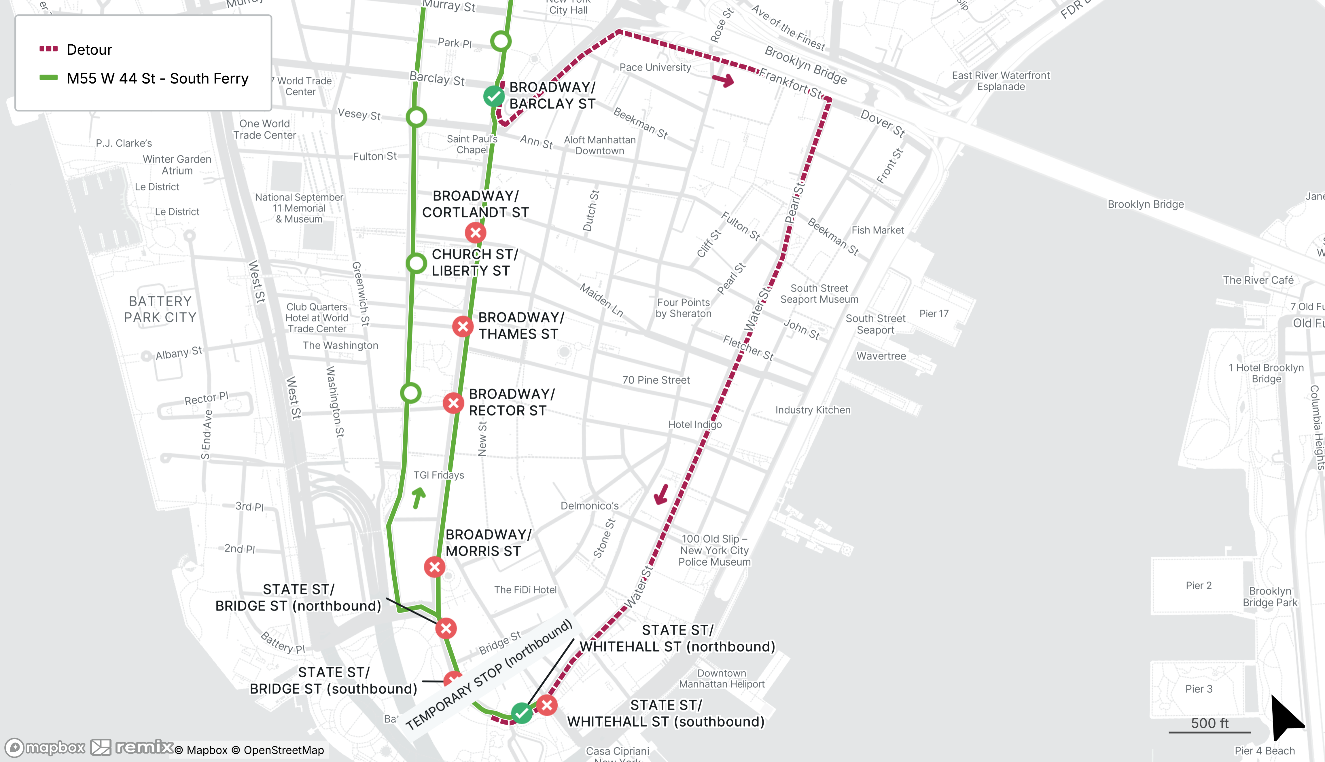 Southbound M55 stops on Broadway from Cortlandt St to Morris and on State St at Bridge St and Whitehall St will be closed