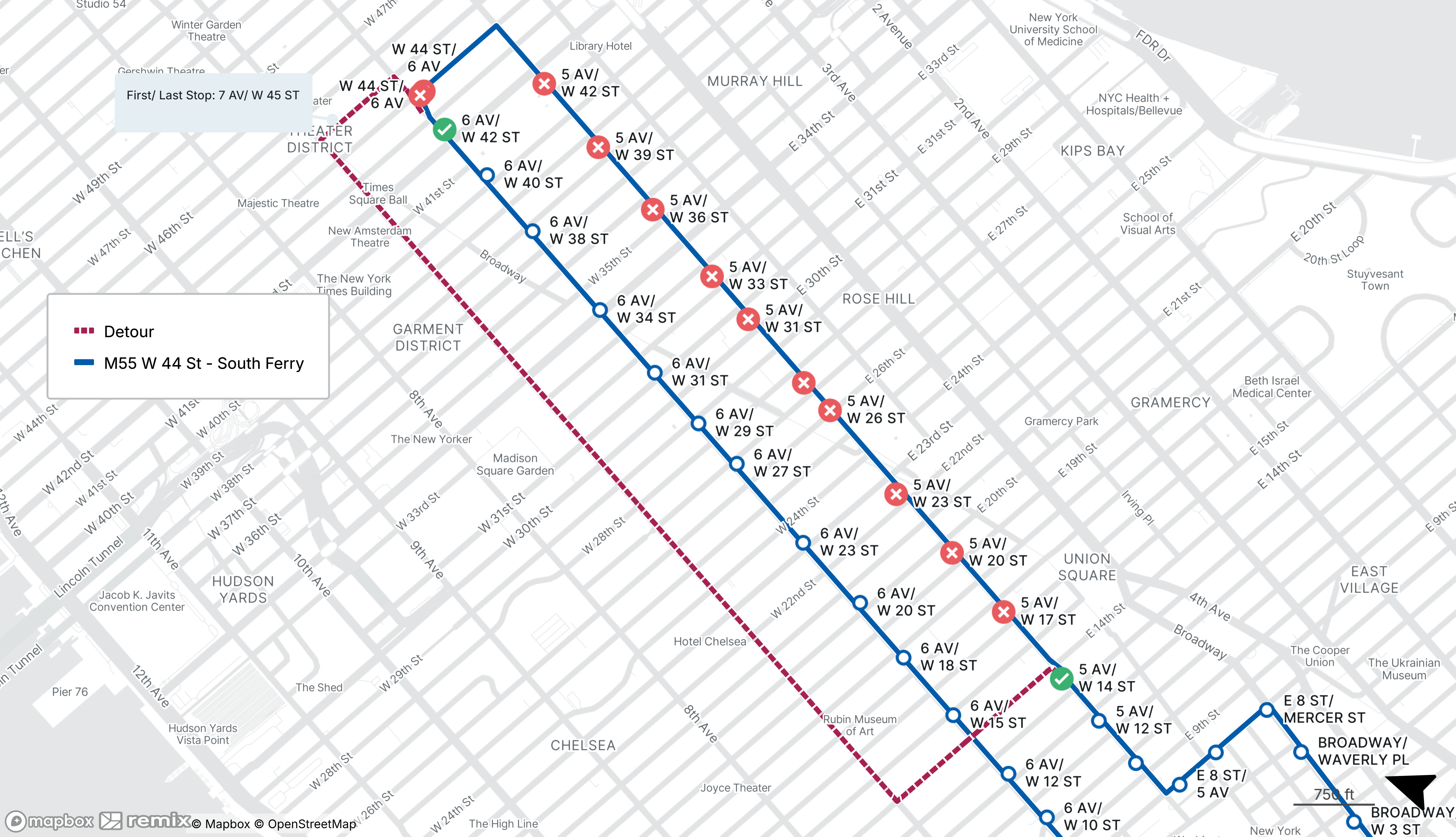The last northbound stop before the detour will be on 6th Ave at W 42nd St.
