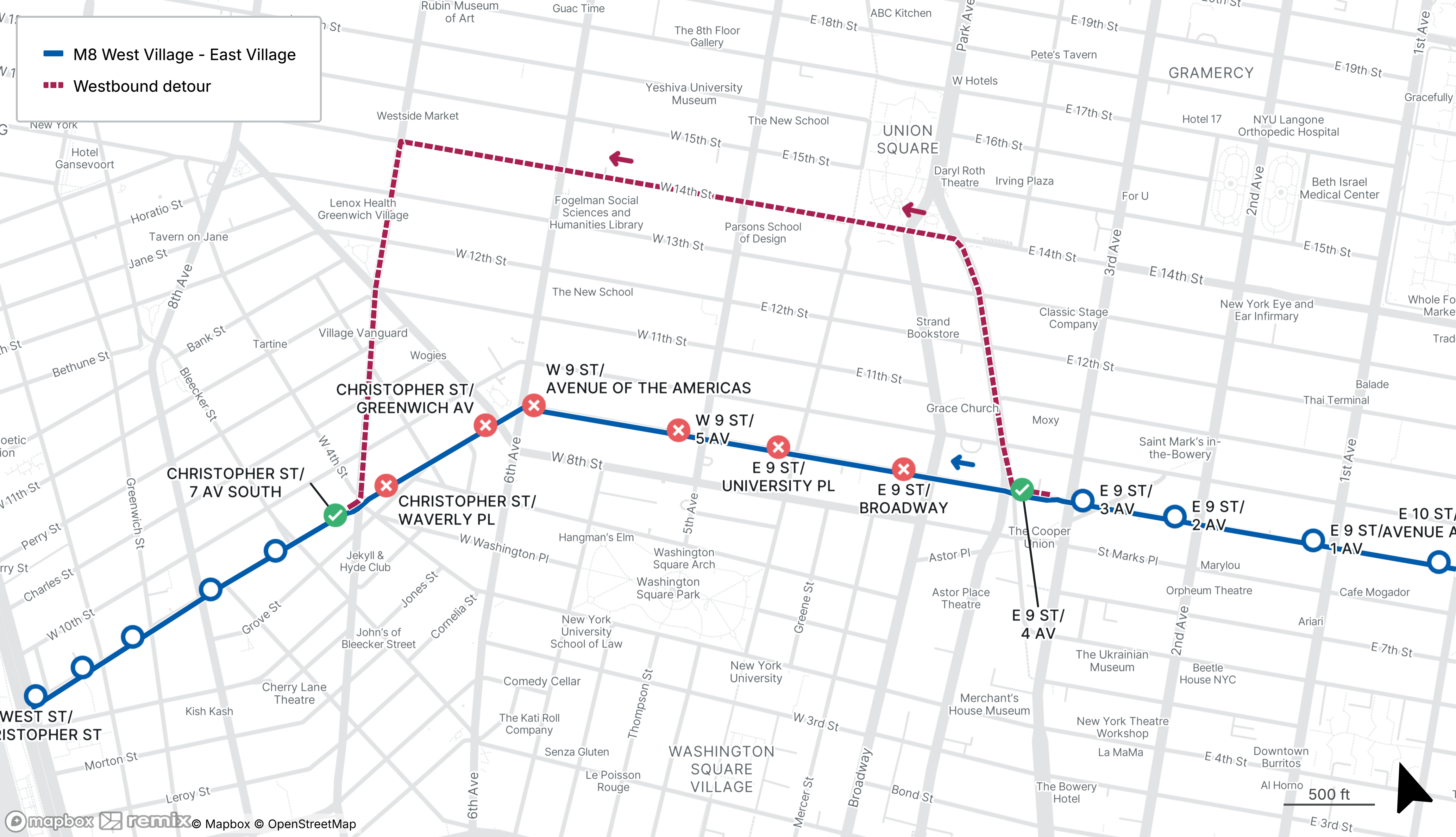 Westbound M8 stops along 9th St from Broadway to 6th Ave and on Christopher St at Greenwich Ave and Waverly Pl will be closed