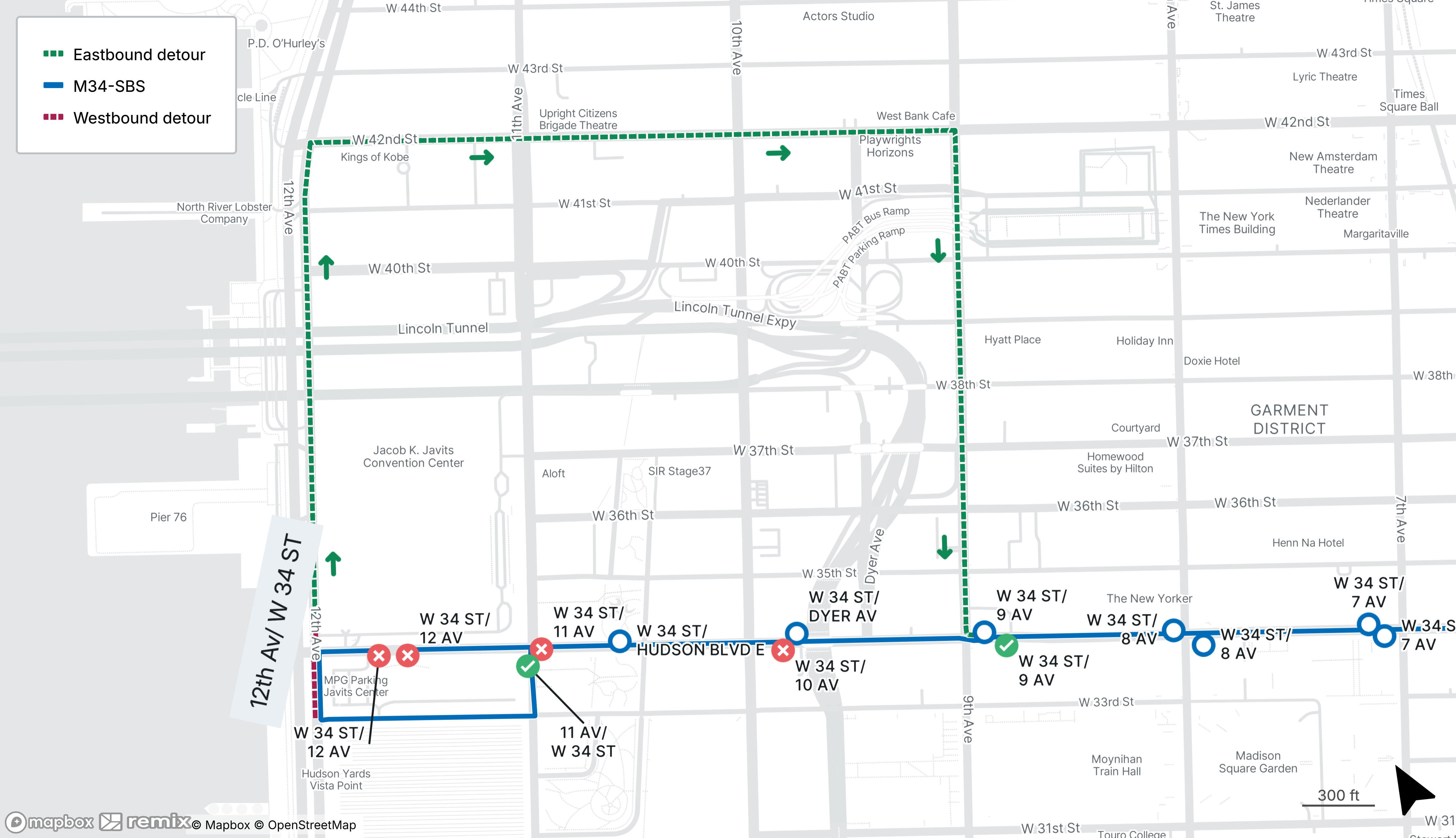 M34-SBS buses will be detoured between 12th Ave at W 34th St and W 34th St at 9th Ave