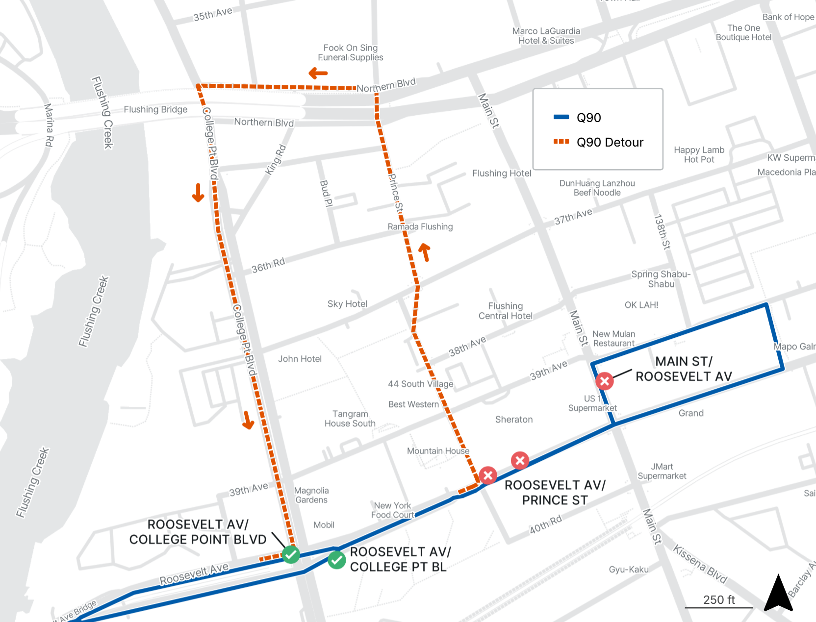 Q90 stops on Roosevelt Ave at Prince St and Main St at Roosevelt Ave are closed