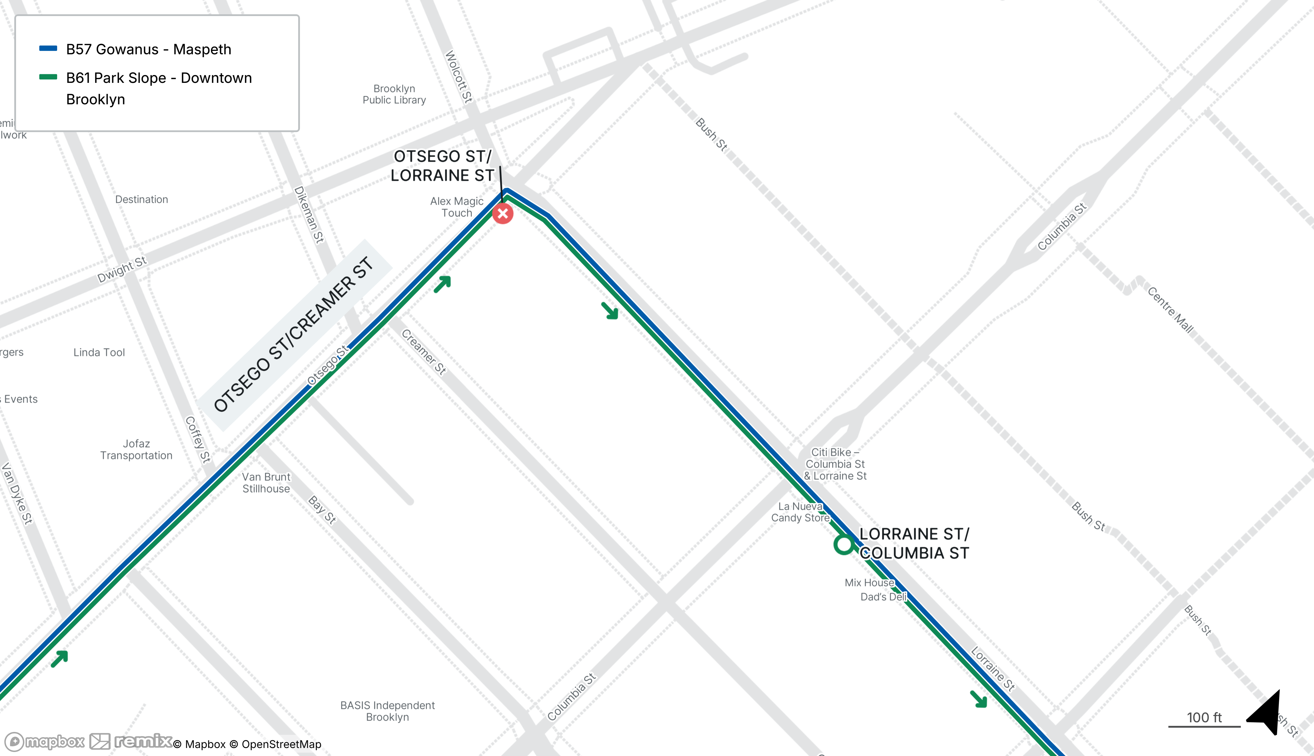 Southbound B61 and northbound B57 stop on Otsego St at Lorraine St is closed, use the temporary stop on Otsego St at Creamer St