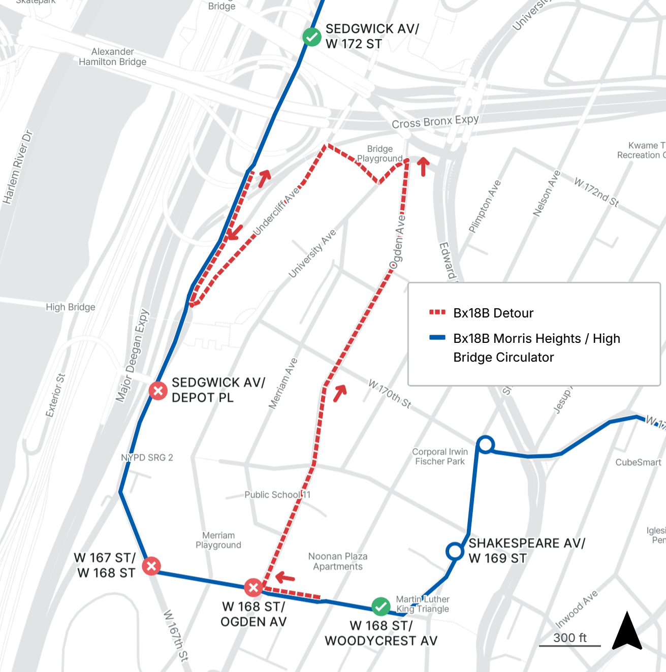 Bx18B stops on W 168th St at Ogden Ave, W 167th St at W 168th St and Sedgwick Ave at Depot Pl are closed