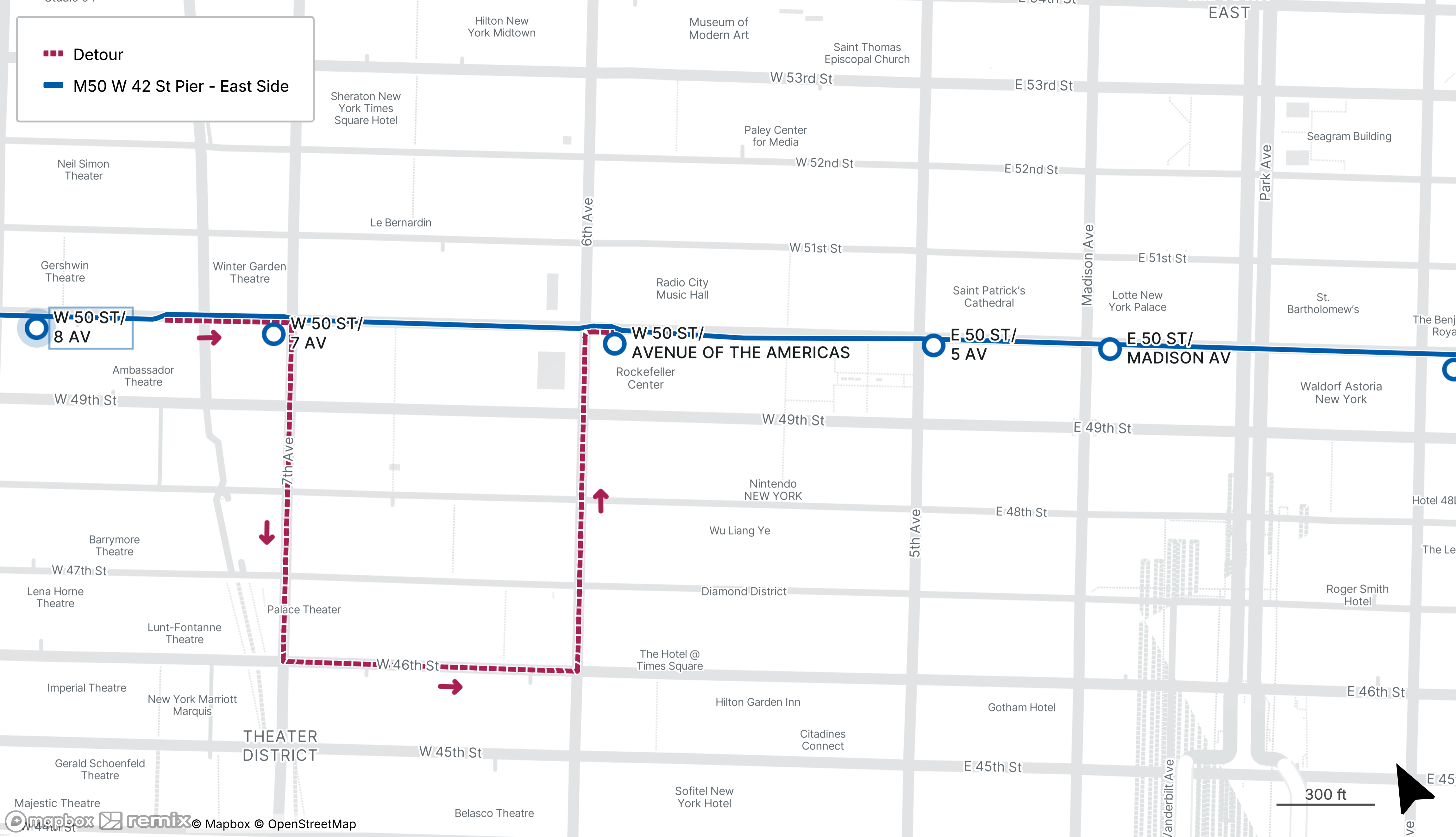 Eastbound M50 buses will be detoured from W 50th St at 7th Ave to 6th Ave at W 50th St - no stops will be missed