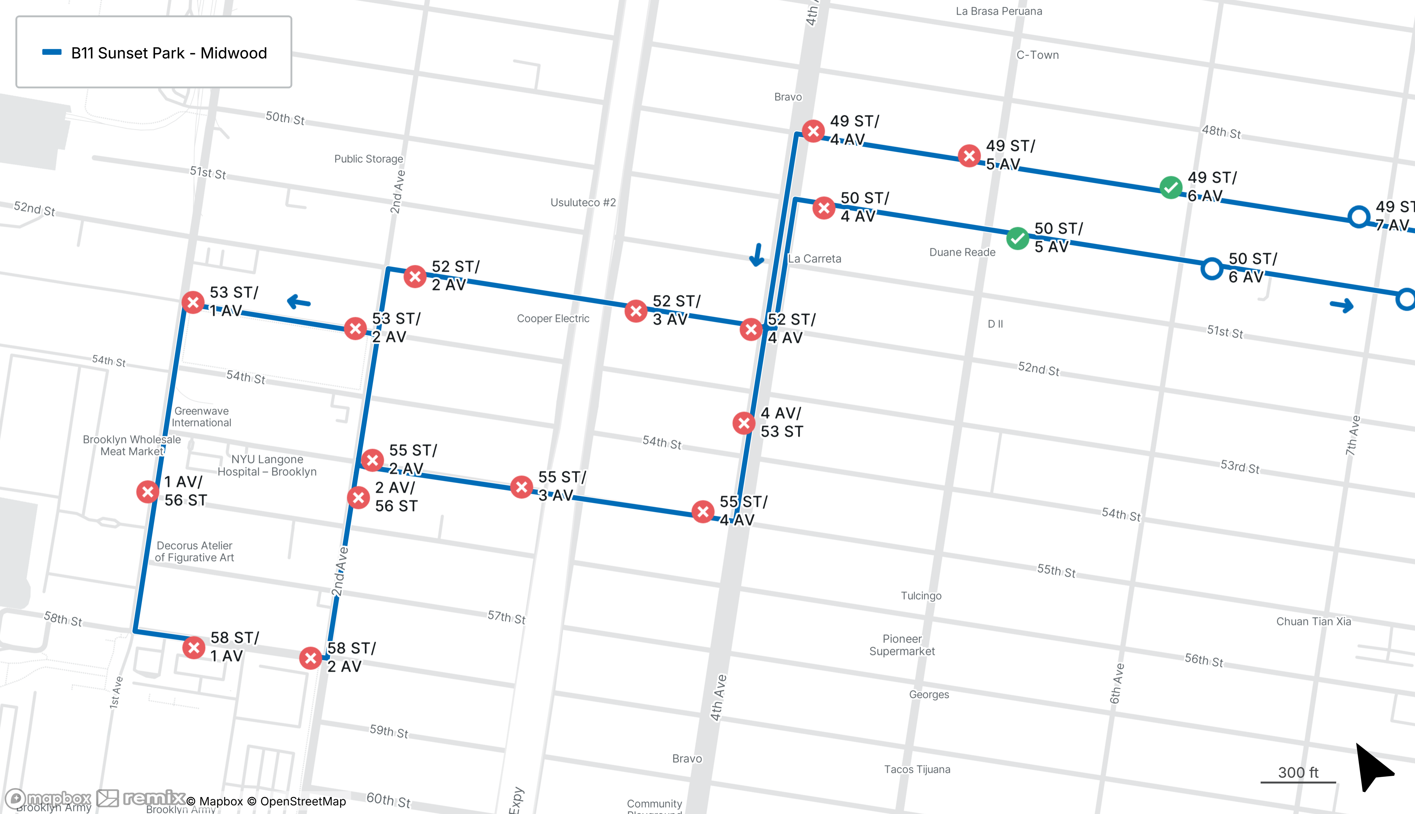 B11 stops between 58th St at 1st Ave and 5th Ave at 49th St will be closed