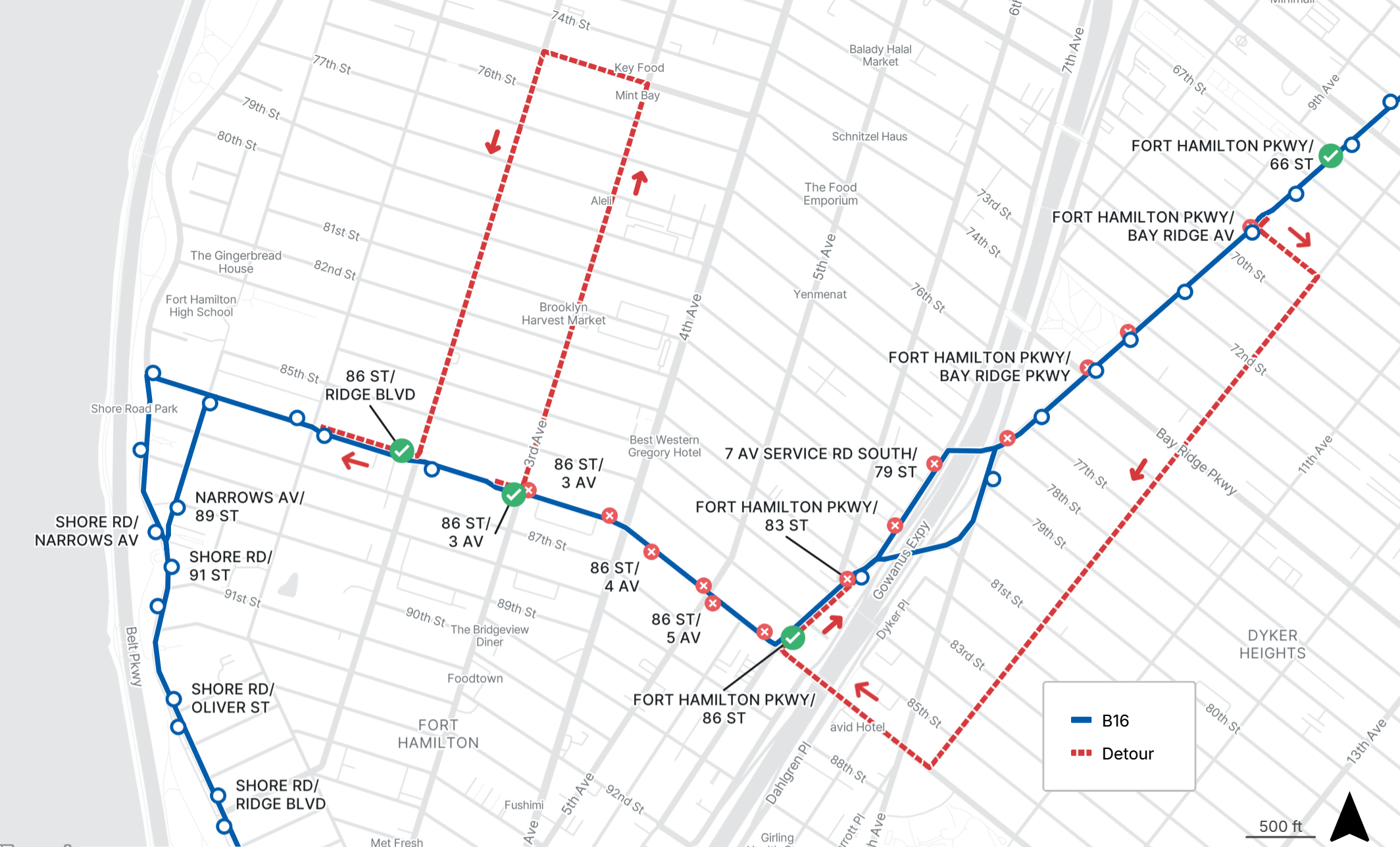 No B16 service on 86th St between Fort Hamilton Pkwy and 3rd Ave and southbound buses are detoured from Fort Hamilton Pkwy at Bay Ridge Ave to 86th St