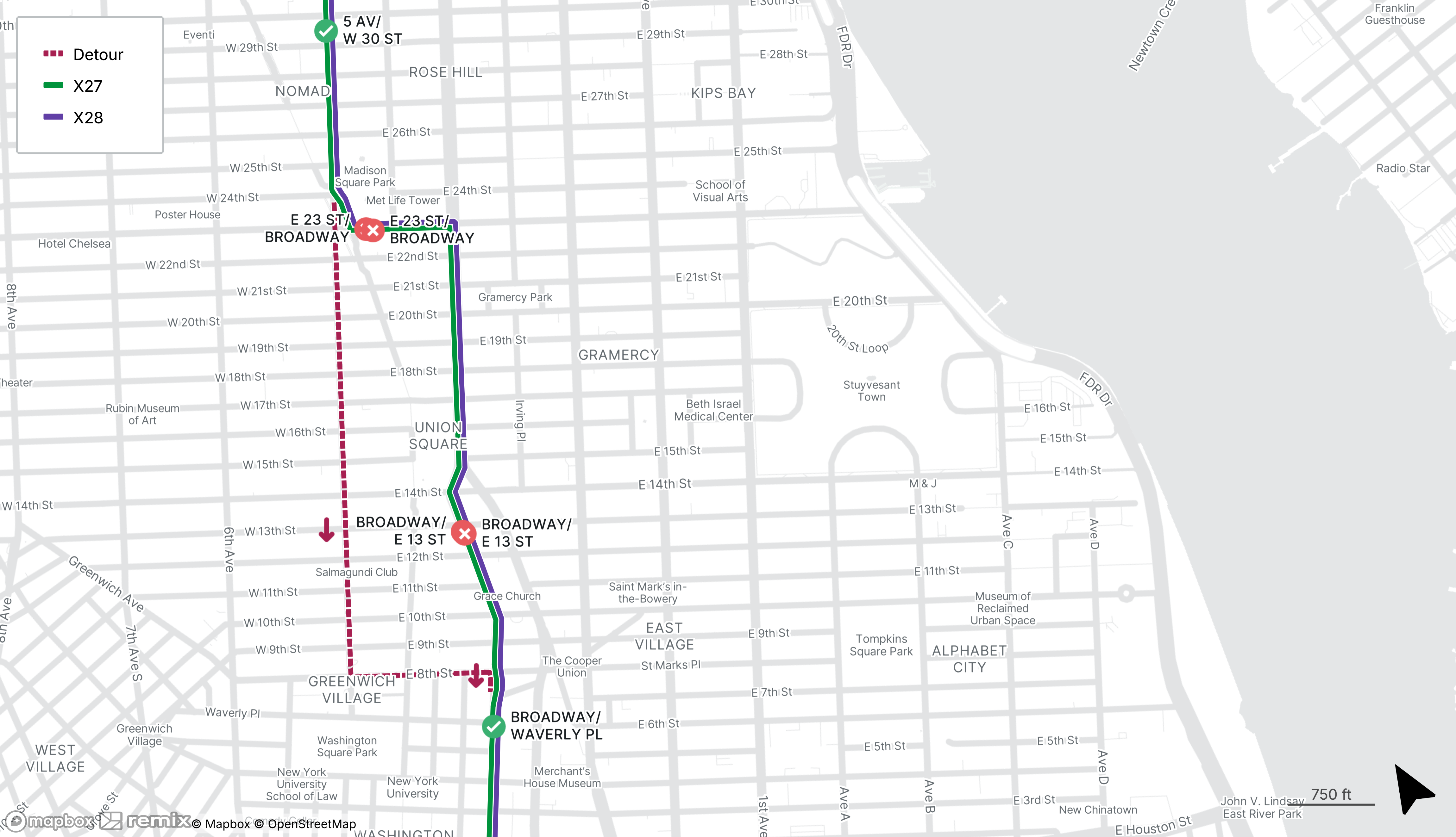 Southbound X27 and X28 stops on E 23rd St at Broadway and Broadway and E 13th St will be closed