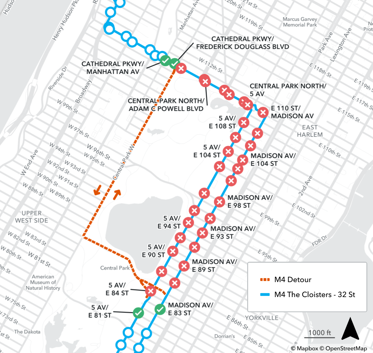 M4 buses are detoured in both directions between Madison Ave at E 85th St and W 110th St at Central Park West