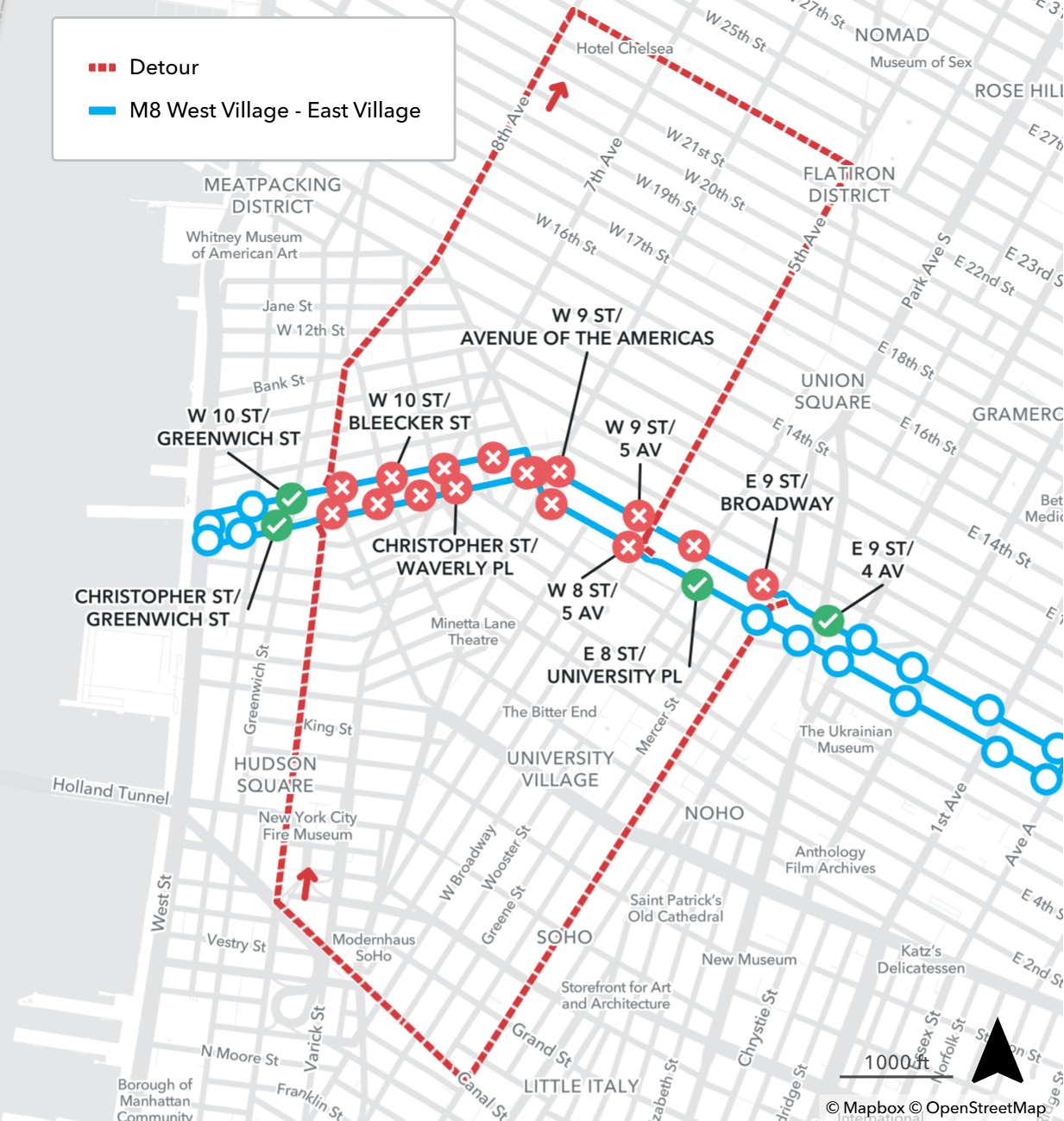 M8 buses will be detoured between 10th St at Hudson St and 9th St at Broadway in both directions