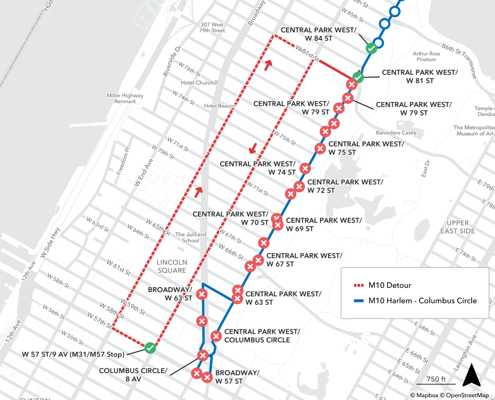 No M10 service between Central Park West at W 86th St and 8th Ave at W 57th St; buses will instead detour via Columbus Ave and Amsterdam Ave to/from 57th St