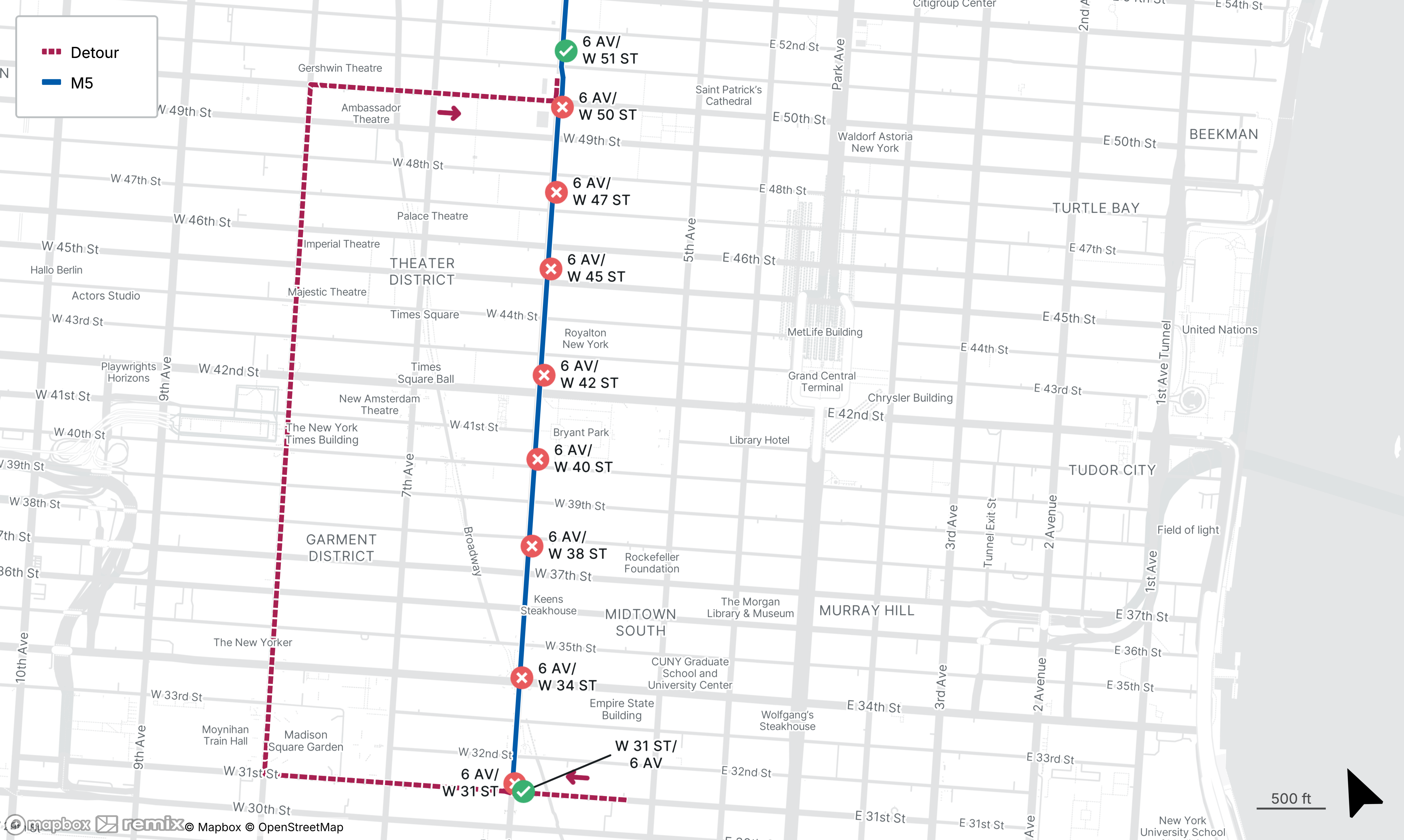 Northbound M5 stops on 6th Ave from W 31st St to W 50tth St will be closed