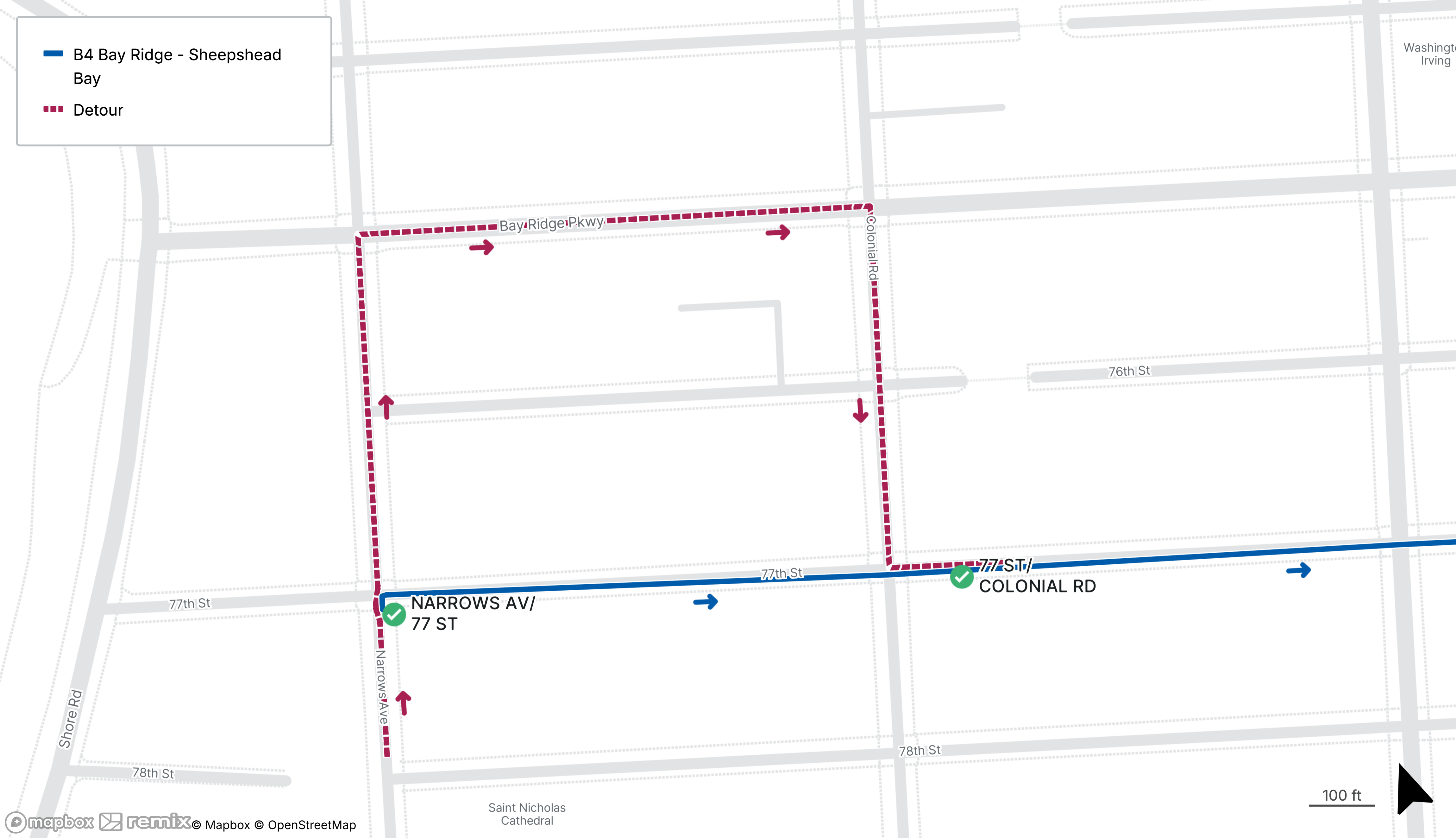 Eastbound B4 buses will be detoured from Narrows Ave at 77th St to Colonial Rd at 77th St - no stops will be missed