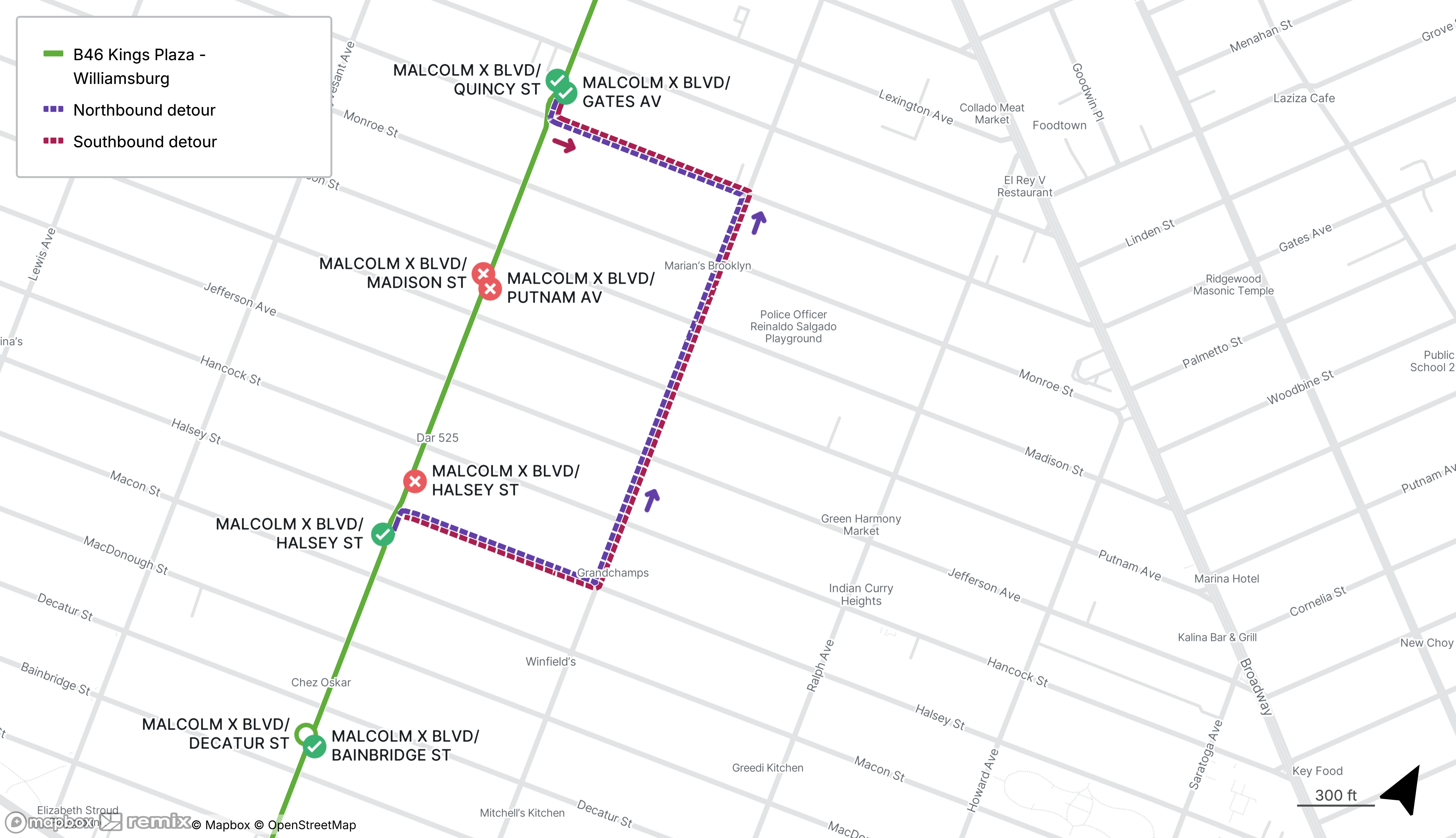 B46southbound stop on Malcolm X Blvd at Madison St and northbound stops on Malcolm X Blvd at Halsey St and Putnam Ave will be closed