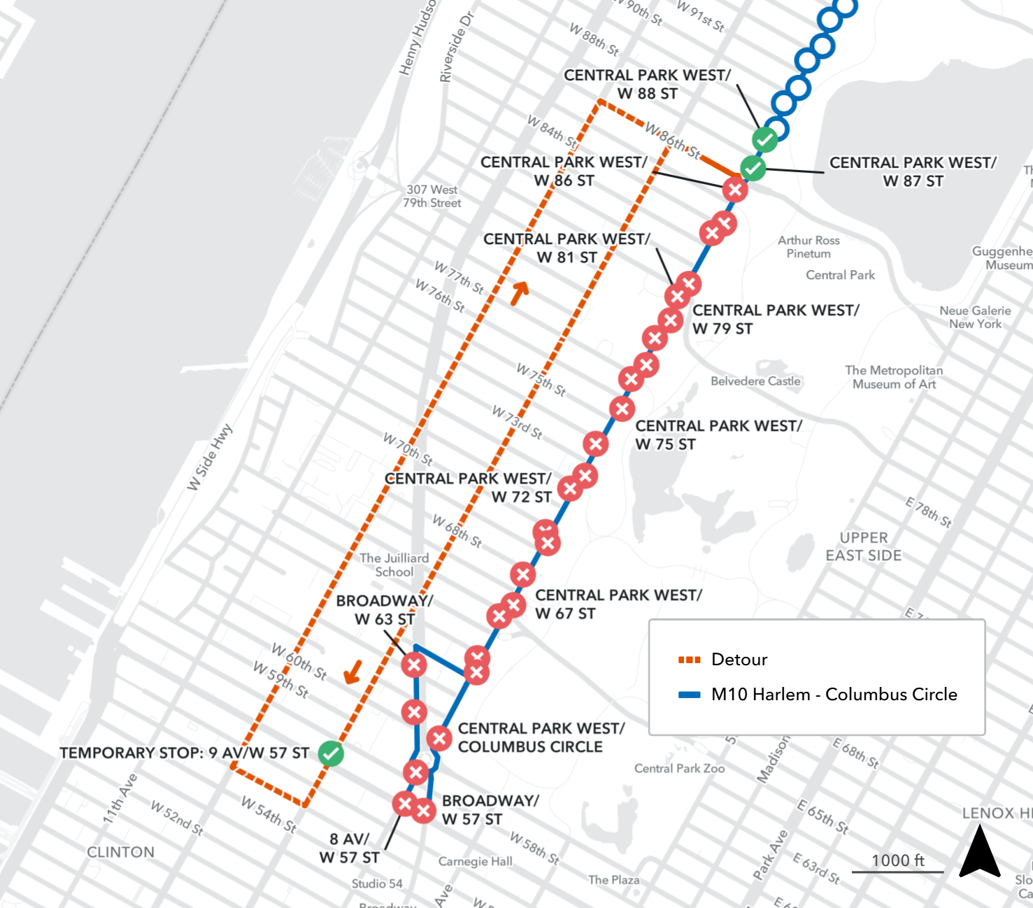 No M10 service between Central Park West at W 86th St and 8th Ave at W 57th St; buses will instead detour via Columbus Ave and Amsterdam Ave to/from 57th St