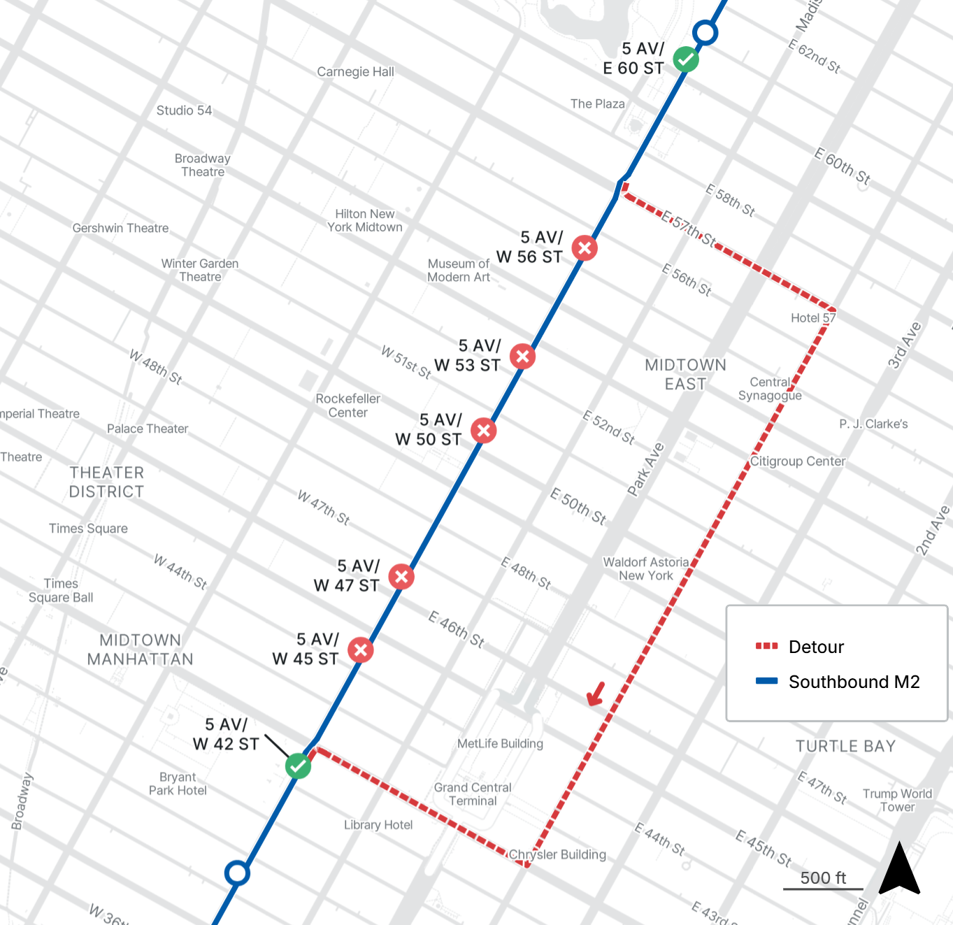 Southbound M2 stops along 5th Ave from W 56th St to W 45th St are closed