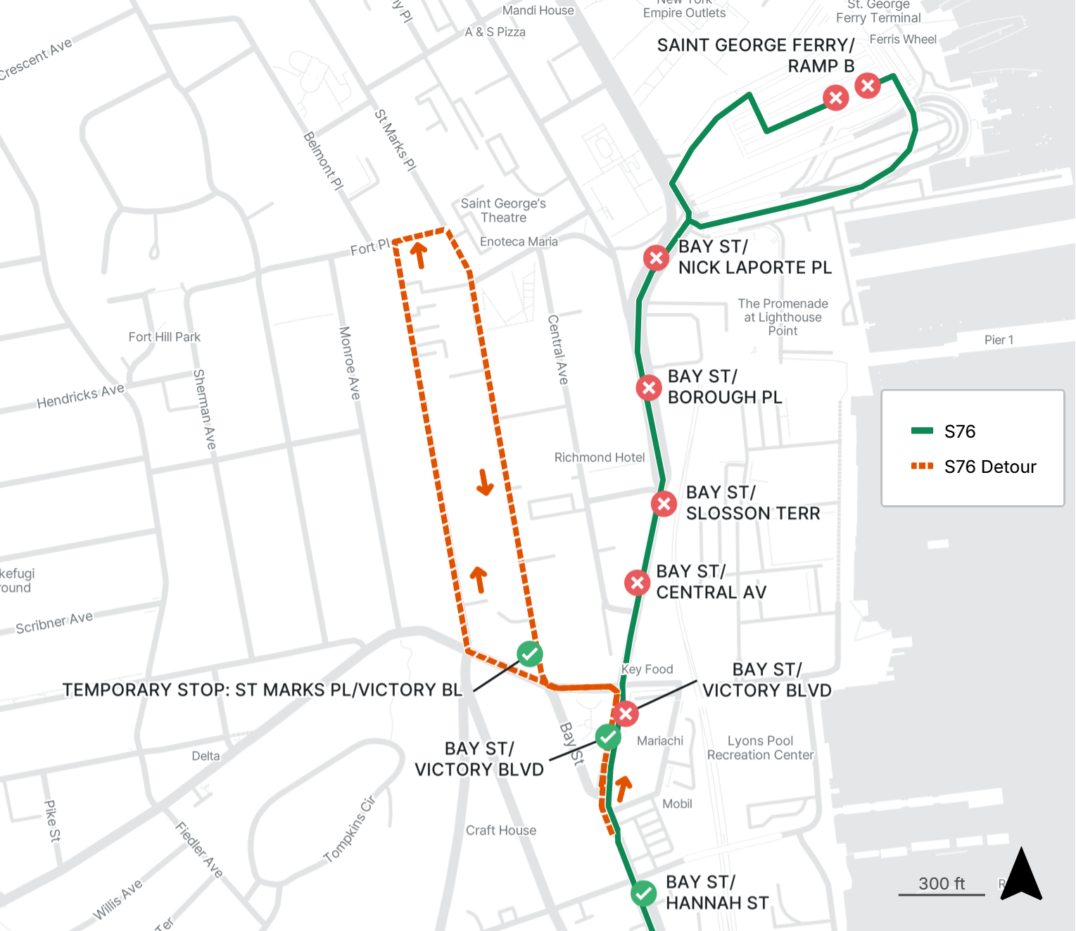 S76 stops along Bay St between Victory Blvd and St George Ferry Terminal are closed in both directions