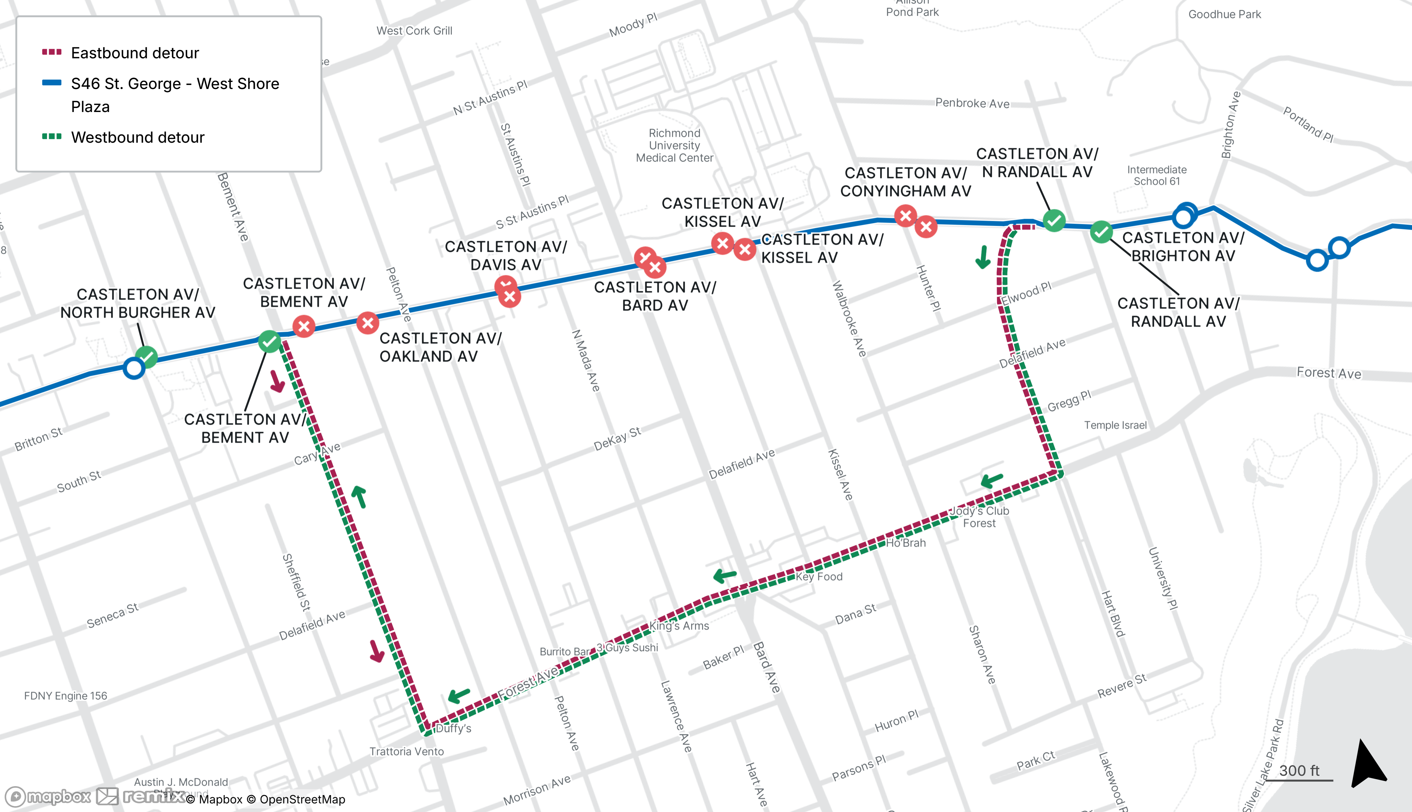 S46 buses will be detoured from Castleton Ave between Bement Ave and Hart Blvd
