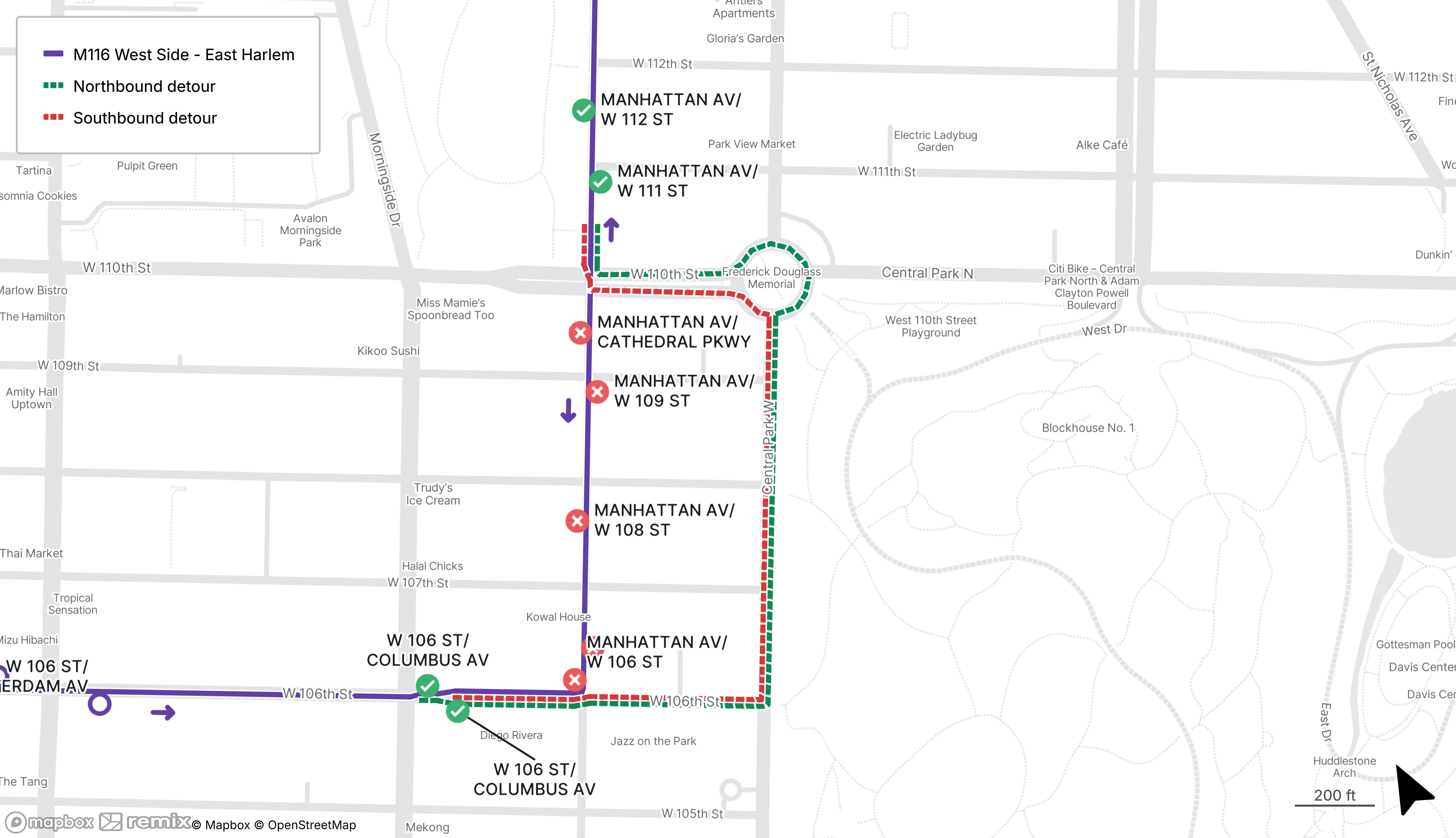 M116 buses will be detoured between Manhattan Ave at W 110th St and W 106th St at Central Park West