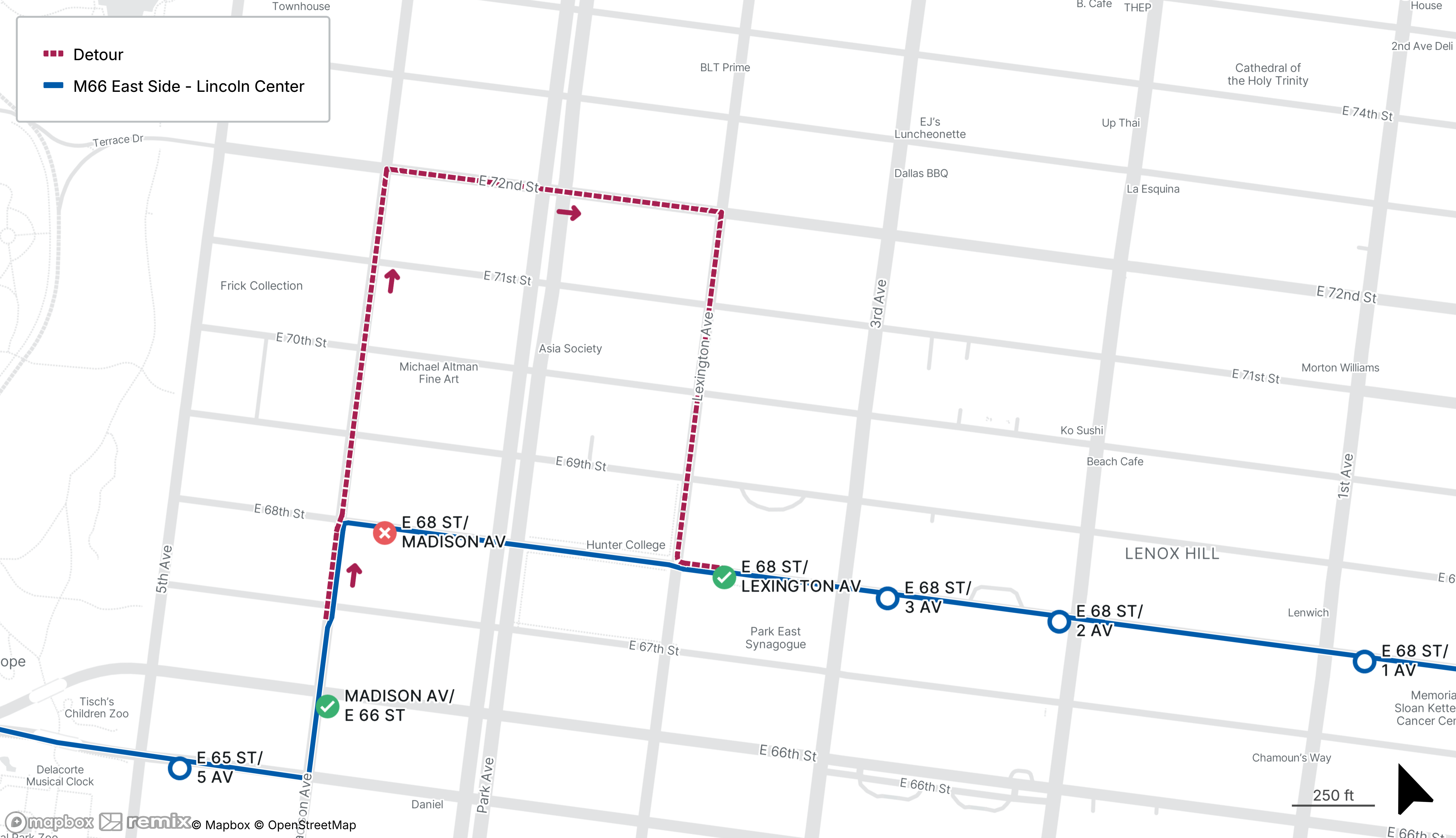 Eastbound M66 stop on E 68th St at Madison Ave will be closed